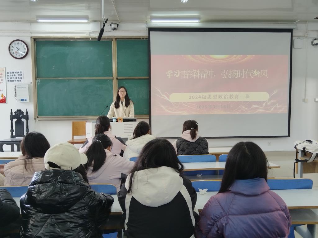为让我班同学深入了解雷锋事迹,领会雷锋精神的内涵,提升同学们的社会责任感和奉献意识,3月14日下午,beat365亚洲版官网2024级思想政治教育一班在社科楼515教室开展“学习雷锋精神,弘扬时代新风”主题团课。本次团课由团支书李冉主持,一班全体同学参加。