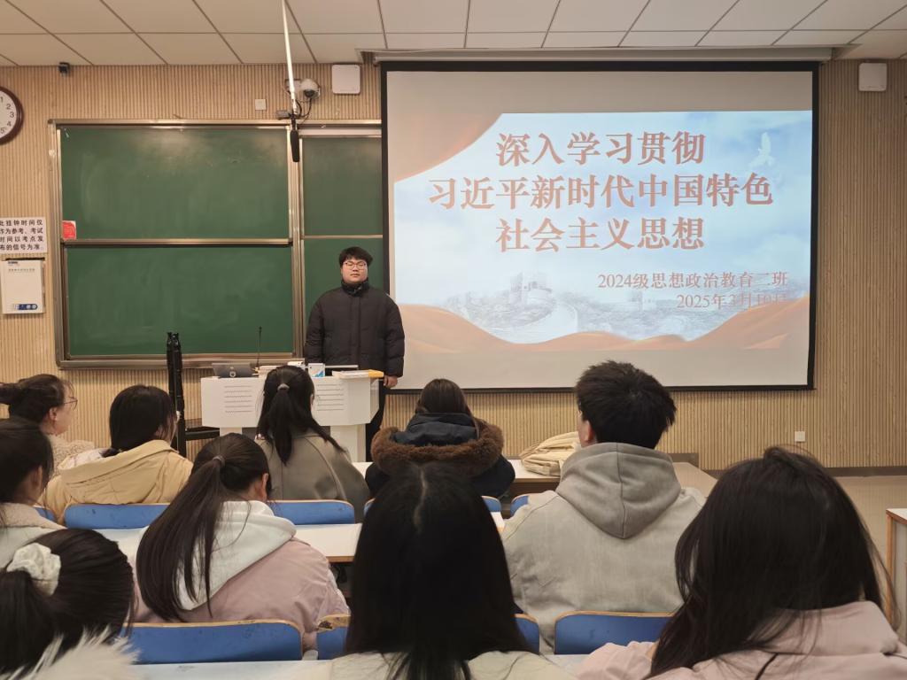 为引导青年学生深入学习习近平新时代中国特色社会主义思想,进一步坚定理想信念,提高政治觉悟,3月10日下午,beat365亚洲版官网2024级思想政治教育二班在社科楼515教室举办了“深入学习贯彻习近平新时代中国特色社会主义思想”主题班会。此次班会由团支书王志颖主持,二班全体同学共同参与。