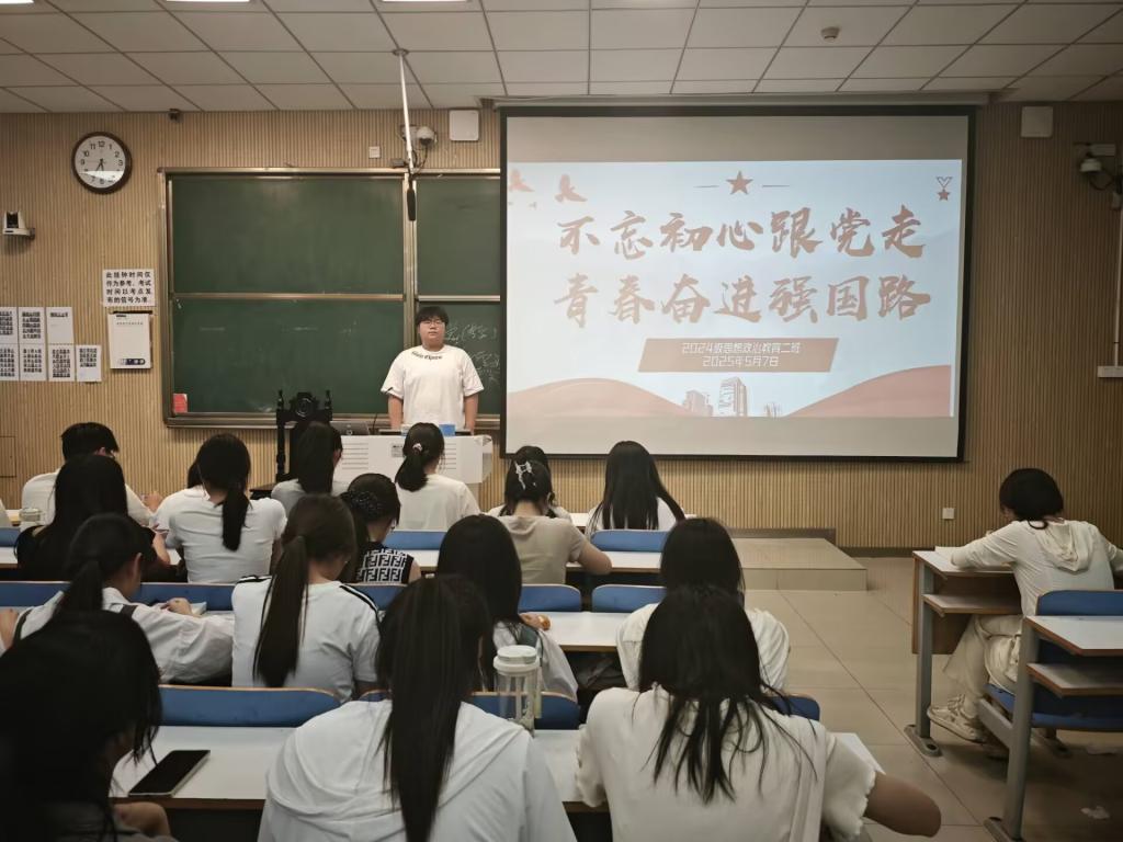 为引导青年学生牢记初心使命,坚定理想信念,以实际行动践行党的领导和时代担当,5月7日下午,beat365亚洲版官网2024级思想政治教育二班在社科楼515教室举办了“不忘初心跟党走,青春奋进强国路”主题团课。此次团课由团支书王志颖主持,二班全体同学共同参与。