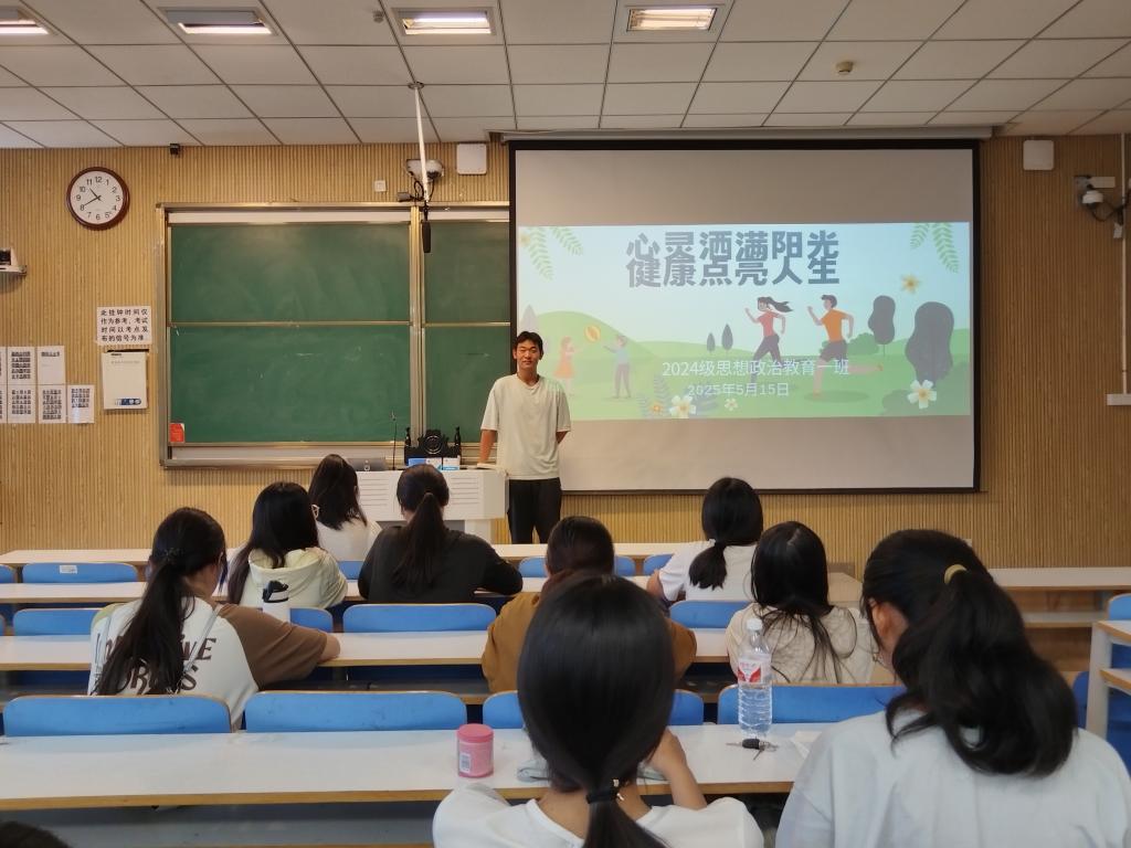 为提升我班学生心理健康意识,促进其身心健康全面发展,5月15日下午,2024级beat365亚洲版官网思想政治教育一班于社科楼515教室开展“心灵洒满阳光,健康点亮人生”主题班会。本次班会由副班长马奔主持,一班全体同学参加。