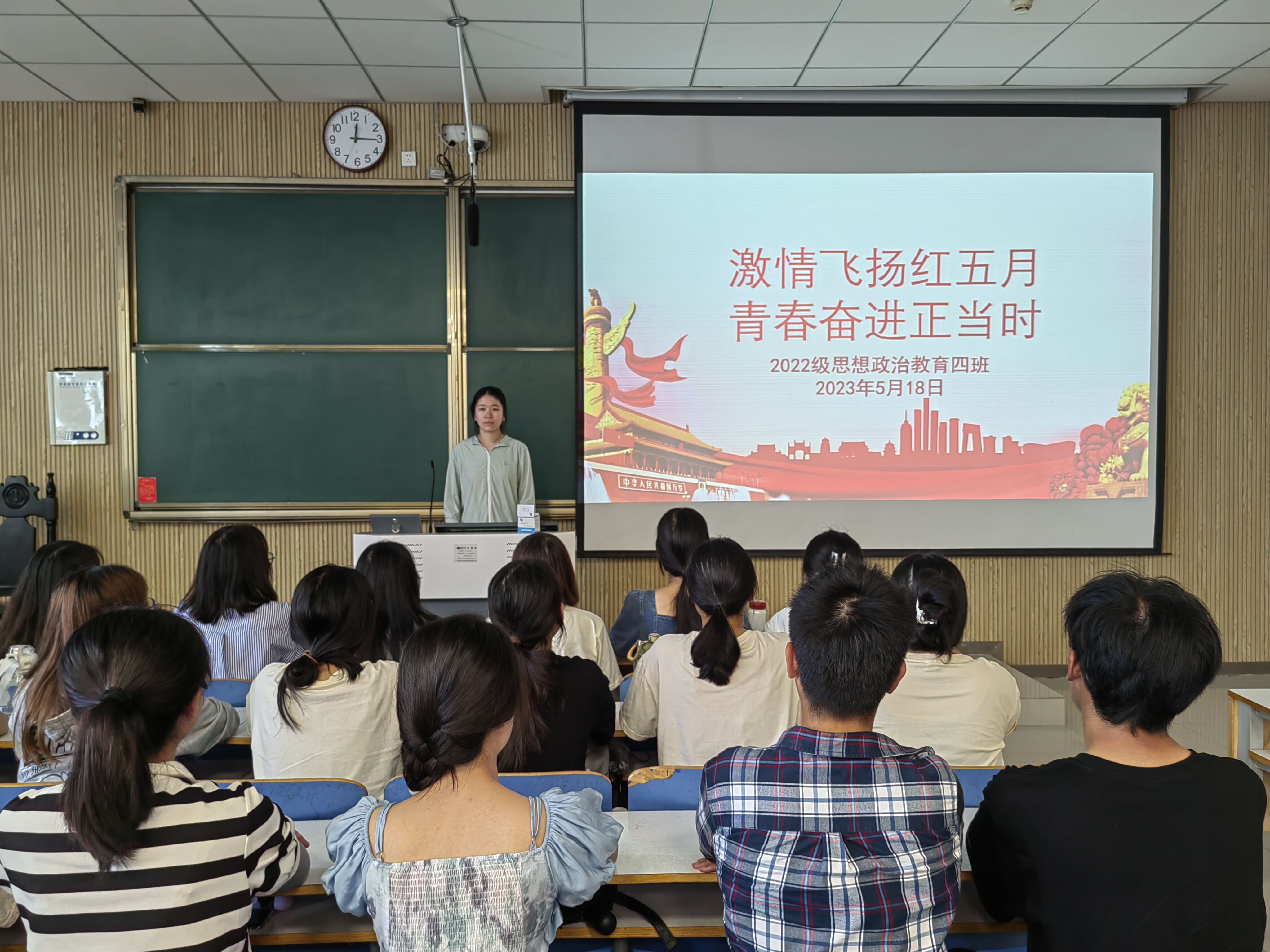5月18日上午,beat365亚洲版官网2022级思想政治教育四班在社科楼515教室召开“激情飞扬红四月,青春奋进正当时”主题团课,beat365官网2022级思想政治教育四班全体同学参与本次团课。团支书牛志杰主持团课。