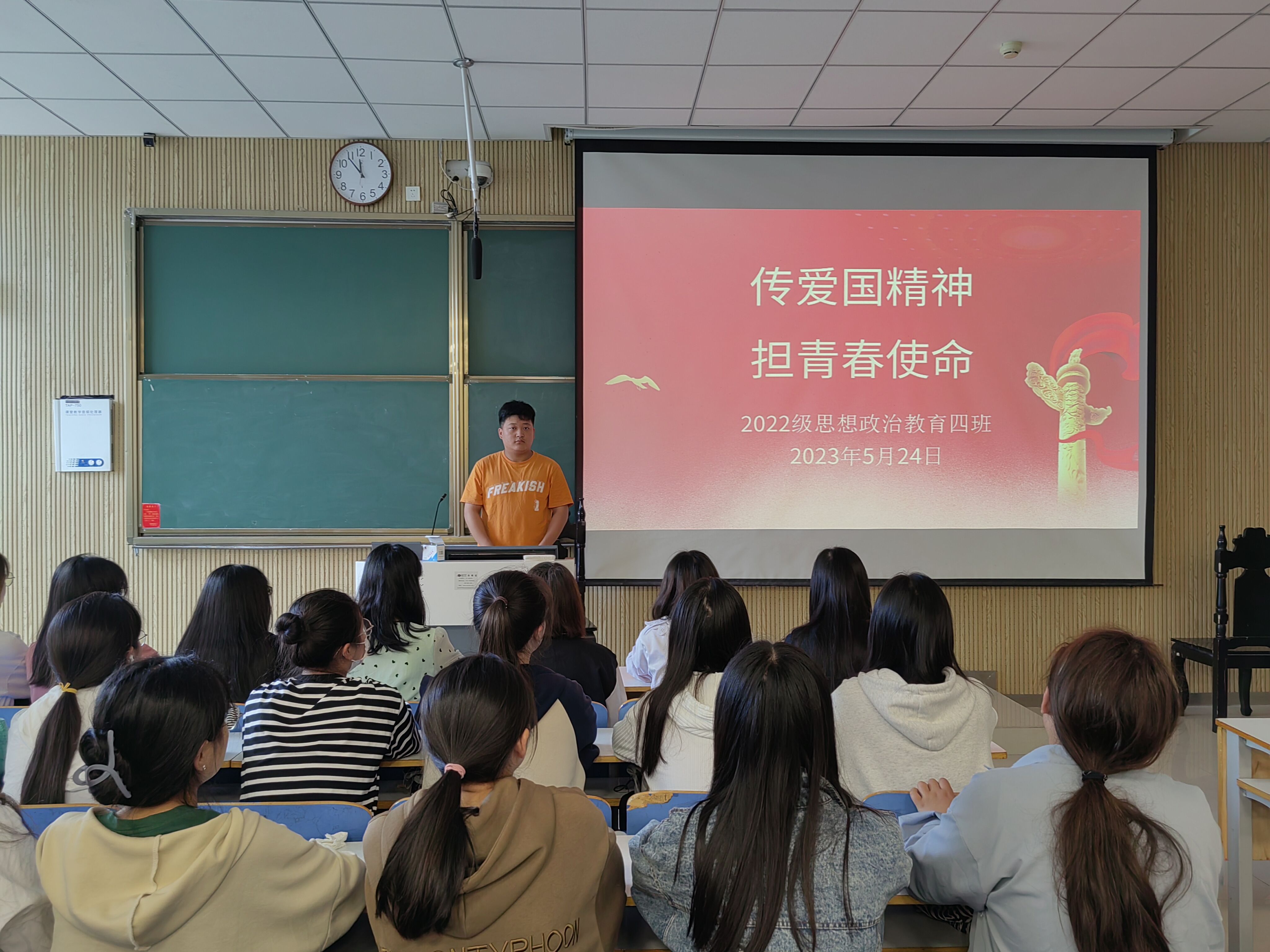 为加强爱国主义教育,培养同学们的爱国主义情怀, 5月24日上午,beat365亚洲版官网2022级思想政治教育四班在社科楼515教室召开“传爱国精神,担青春使命”主题班会,beat365官网2022级思想政治教育四班全体同学参加本次班会。会议由副班长宋奕铭主持。