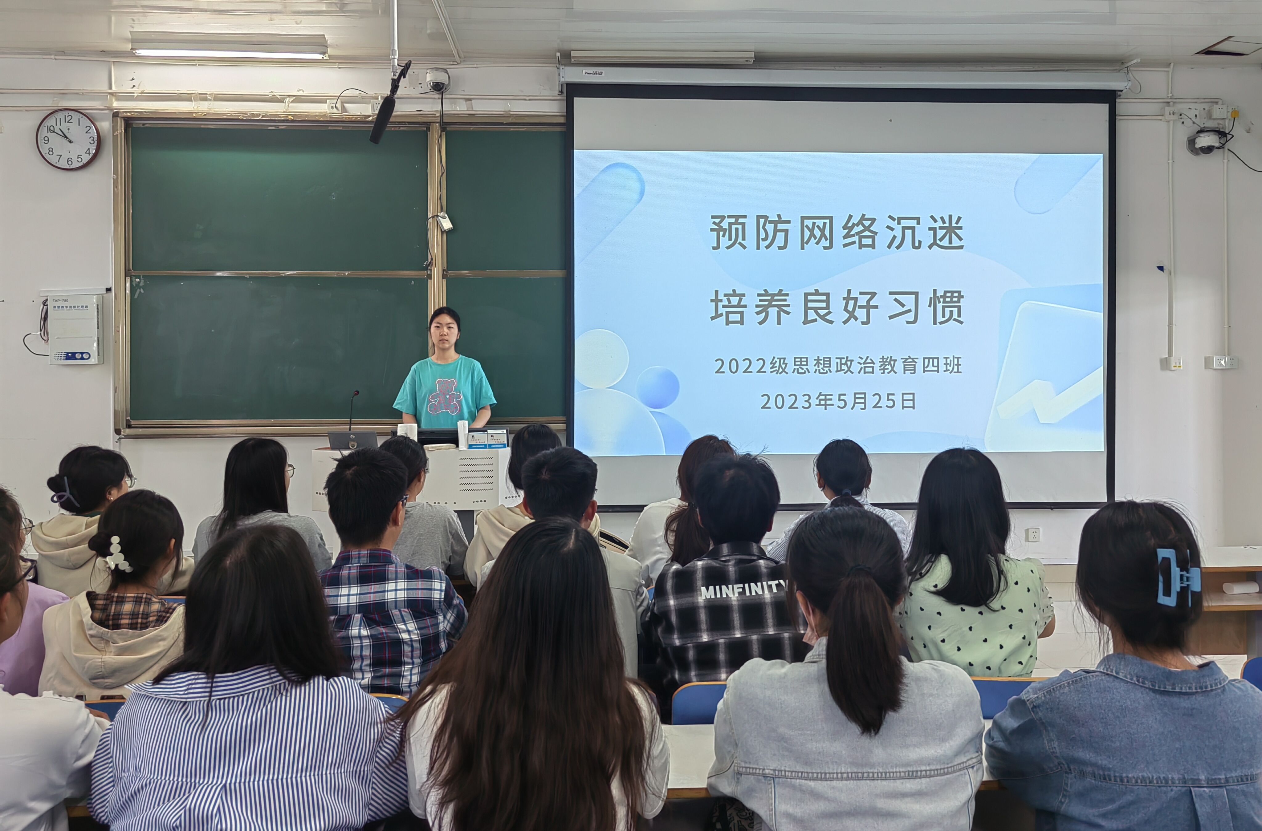 5月25日上午,beat365亚洲版官网2022级思想政治教育四班在社科楼514教室召开“预防网络沉迷,培养良好习惯”主题班会,beat365官网2022级思想政治教育四班全体同学参与本次班会。班长牛志杰主持班会。