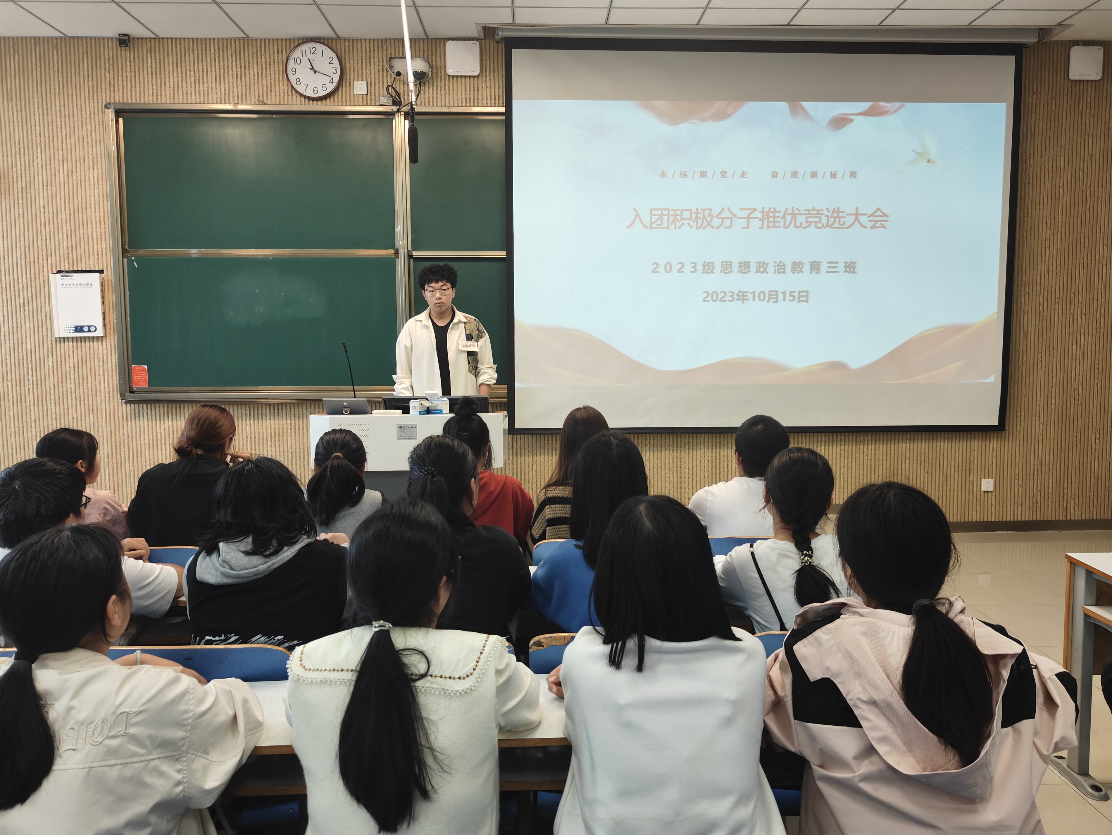 为加强团的组织建设,激励广大青年奋进新征程,10月15日下午,beat365亚洲版官网2023级思想政治教育三班在社科楼515教室举行团员积极分子推选班会。beat365官网2023级思想政治教育三班全体成员共同参加此次班会,班会由团支书郝瀚主持。