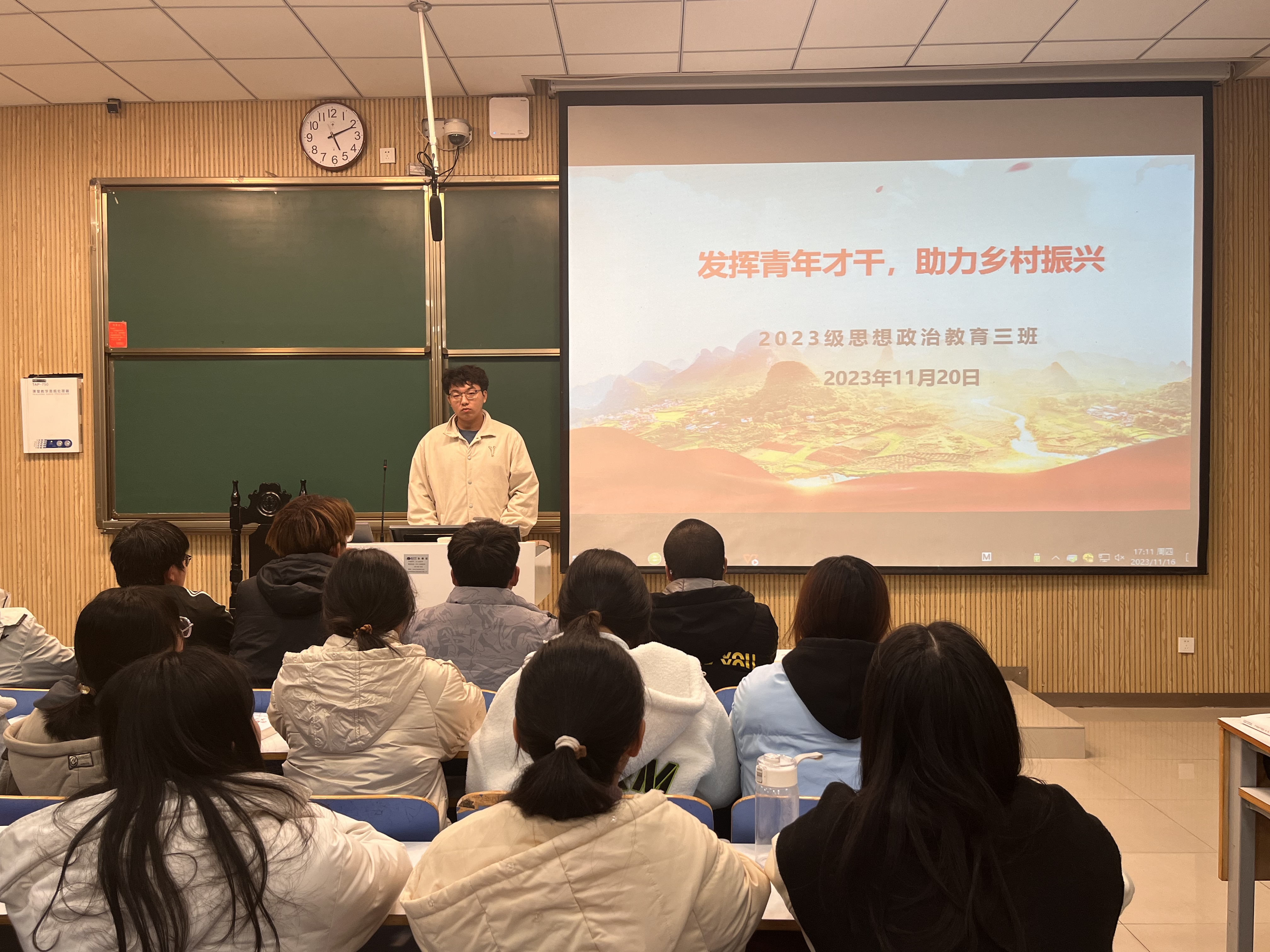 为推动建设美丽中国,发挥青年才干,11月20日上午,beat365亚洲版官网2023级思想政治教育三班在社科楼515教室召开“发挥青年才干,助力乡村振兴”主题团课。beat365官网2023级思想政治教育三班全体成员共同参加此次团课,团课由团支书郝瀚主持。