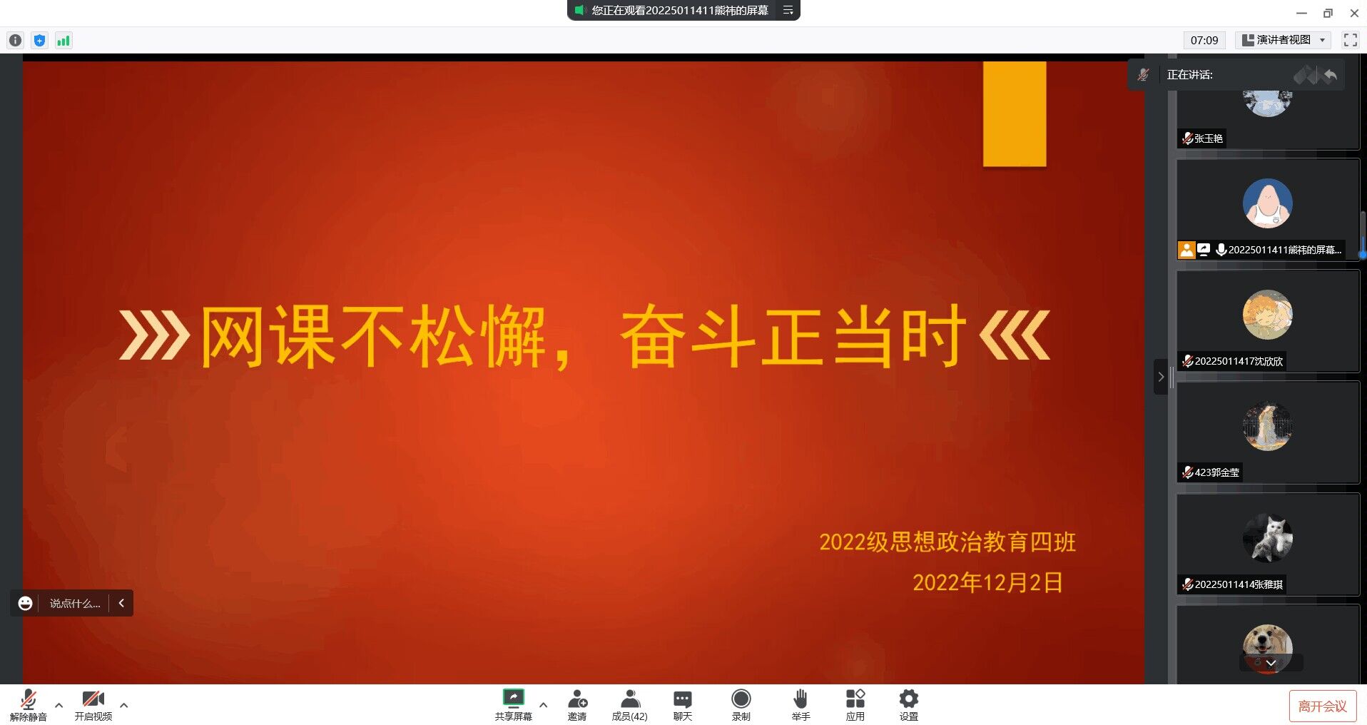 12月2日下午,beat365亚洲版官网2022级思想政治教育四班召开“网课不停歇,奋斗正当时”主题班会,班会以线上召开腾讯会议的方式进行,2022级思想政治教育四班全体同学参加会议。班会由学习委员熊祎主持。