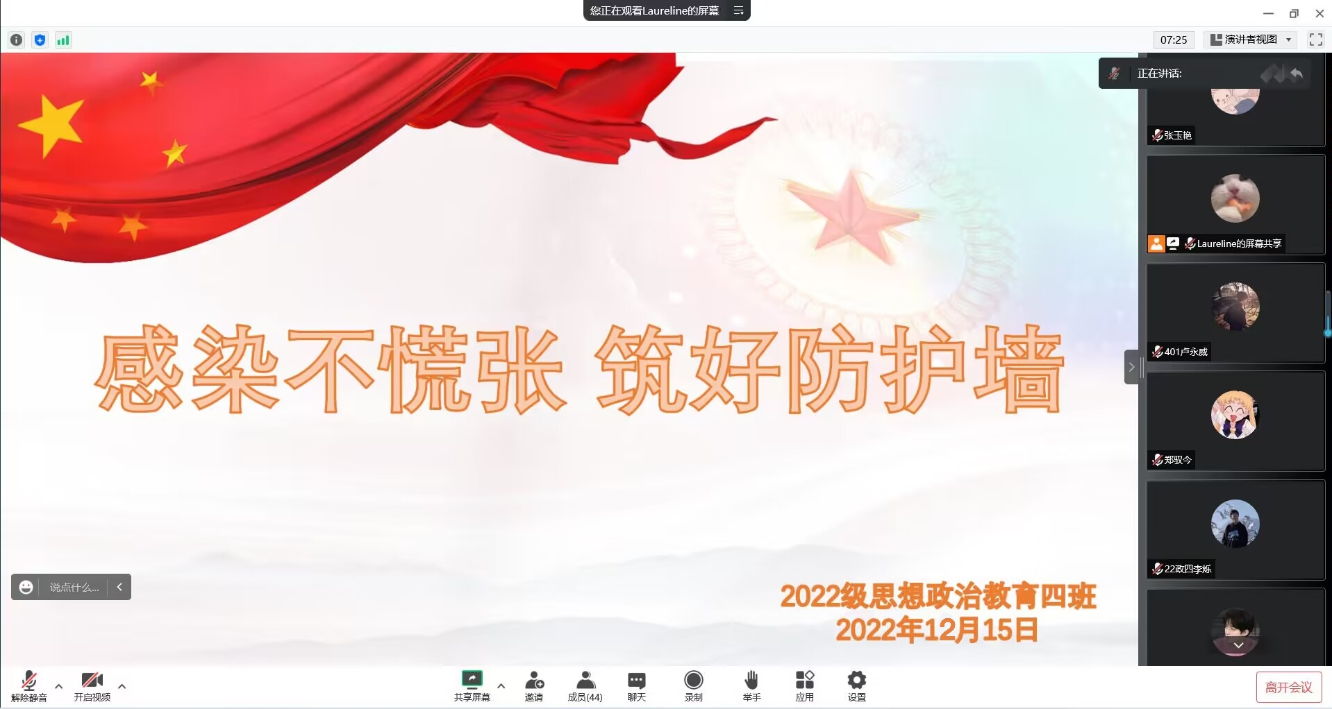 为宣传新形势下的防护政策,缓解同学们的不安情绪,12月15日下午,beat365亚洲版官网2022级思想政治教育四班在线上召开“感染不慌张,筑好防护墙”主题班会,2022级思想政治教育四班全体同学参与本次班会。会议由班长牛志杰主持。