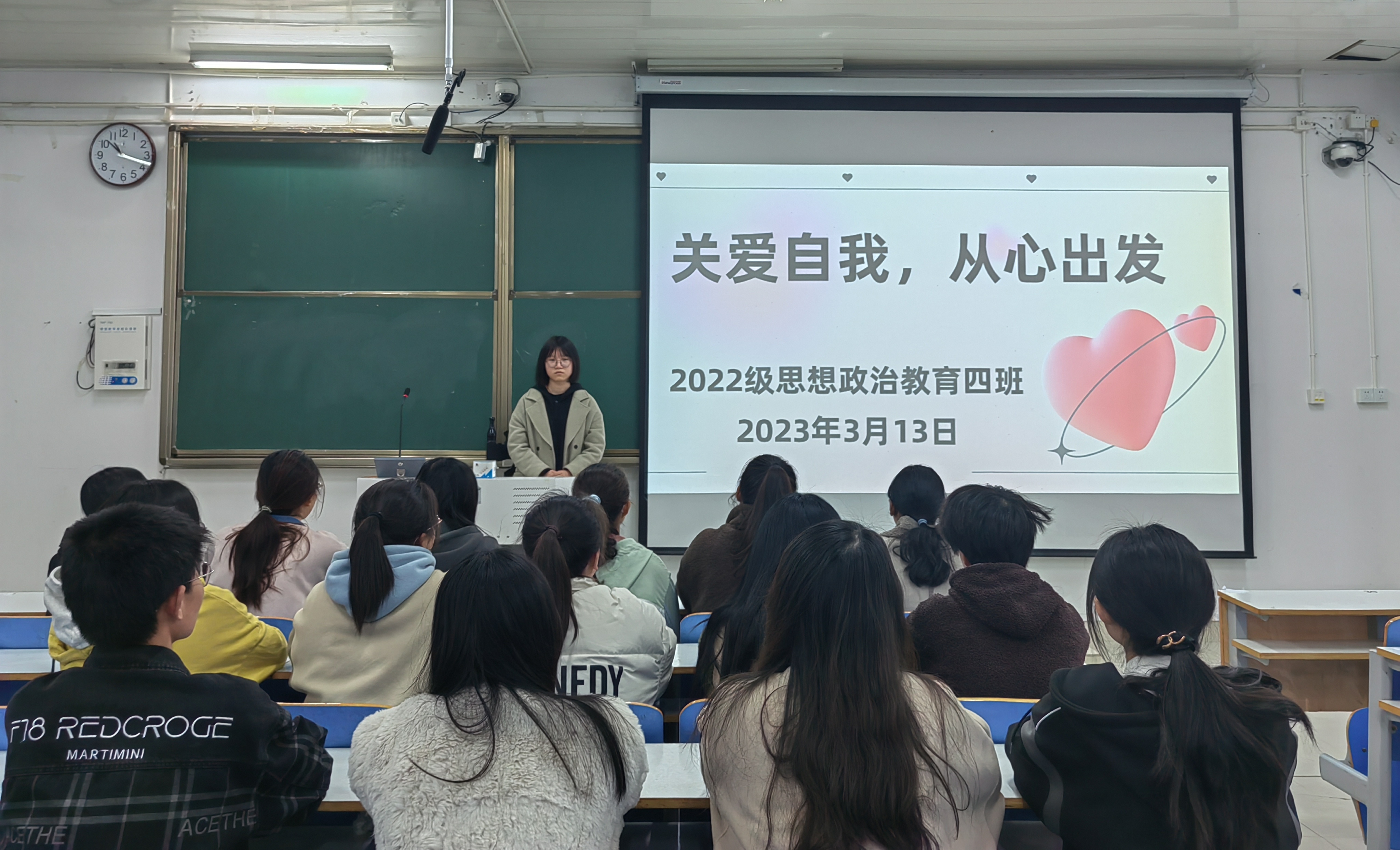 为加强学生心理健康教育,促进其身心和谐发展,3月13日下午,beat365亚洲版官网2022级思想政治教育四班在社科楼514教室召开“关爱自我,从心出发”主题班会,2022级思想政治教育四班全体同学参加本次班会。班会由心理委员徐成若主持。