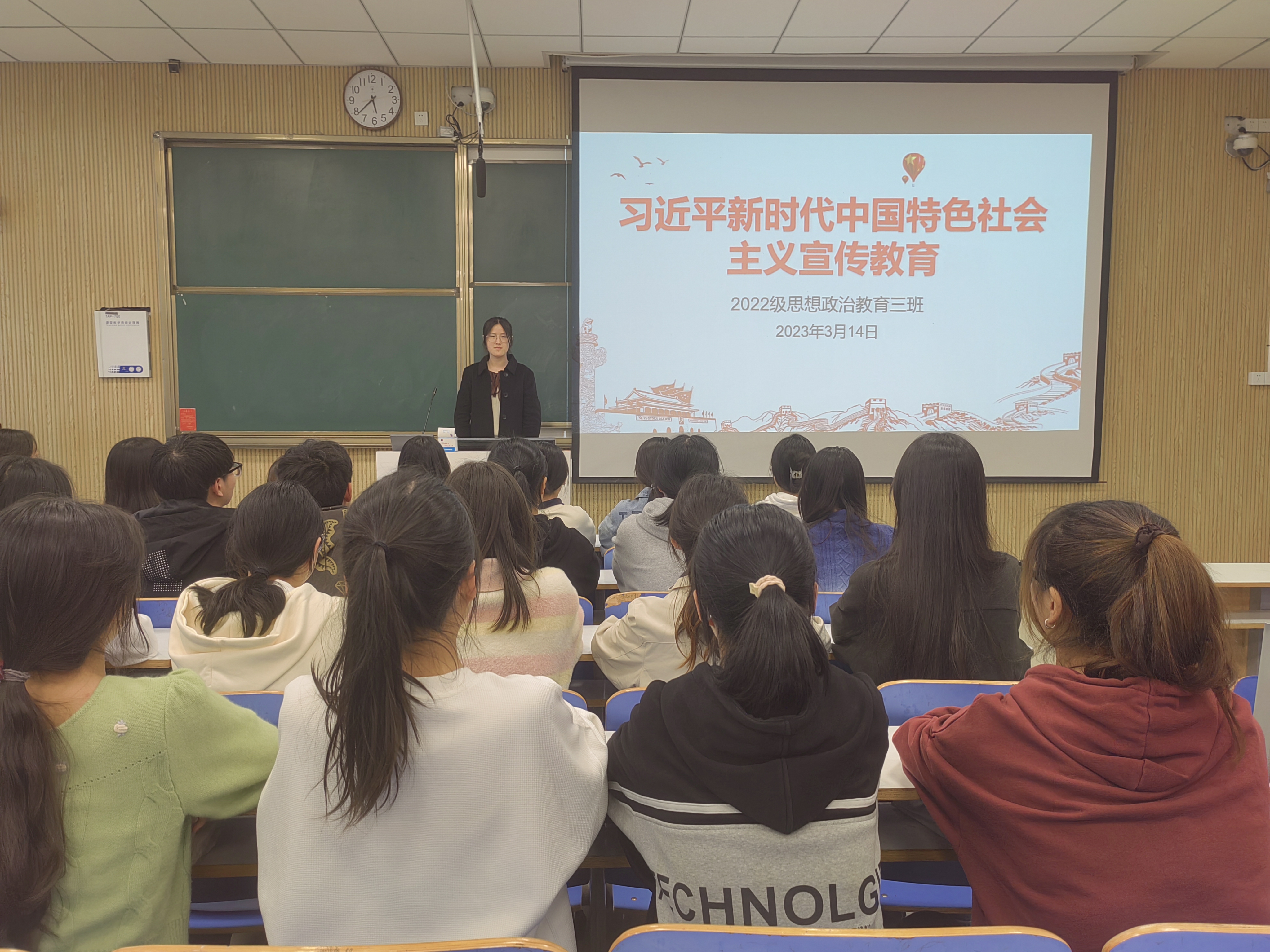 3月14日下午,beat365亚洲版官网2022级思想政治教育三班在社科楼515教室召开习近平新时代中国特色社会主义思想宣传教育主题班会。beat365官网2022级思想政治教育三班全体成员共同参加此次班会。班会由组织委员武文雪主持。