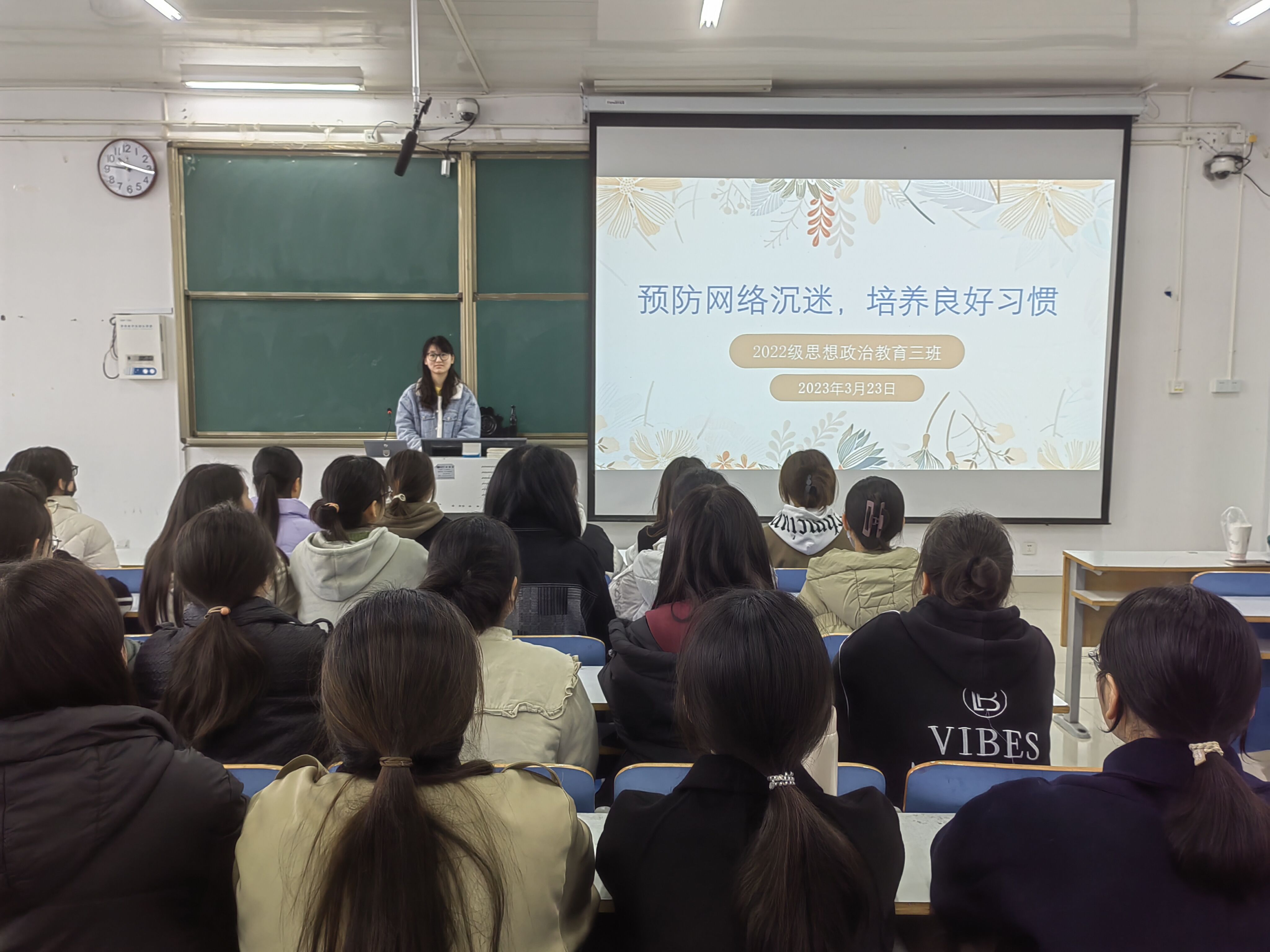 为预防网络沉迷寻方法、找路径,3月23日上午,beat365亚洲版官网2022级思想政治教育三班在社科楼515教室召开“预防网络沉迷,培养良好习惯”主题班会。beat365官网2022级思想政治教育三班全体成员共同参与此次班会。班会由心理委员张韶涵主持。