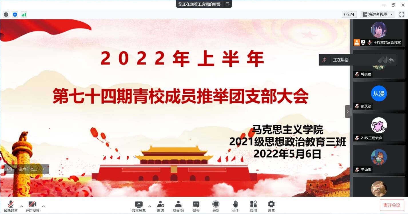 5月6日上午,beat365亚洲版官网2021级思想政治教育三班召开线上第七十四期青校成员推举团支部大会。beat365亚洲版官网2021级思想政治教育三班全体团员参与此次会议。会议由团支书王岚霄主持,秦梦莹担任监票员,陈笑宇担任记录员。