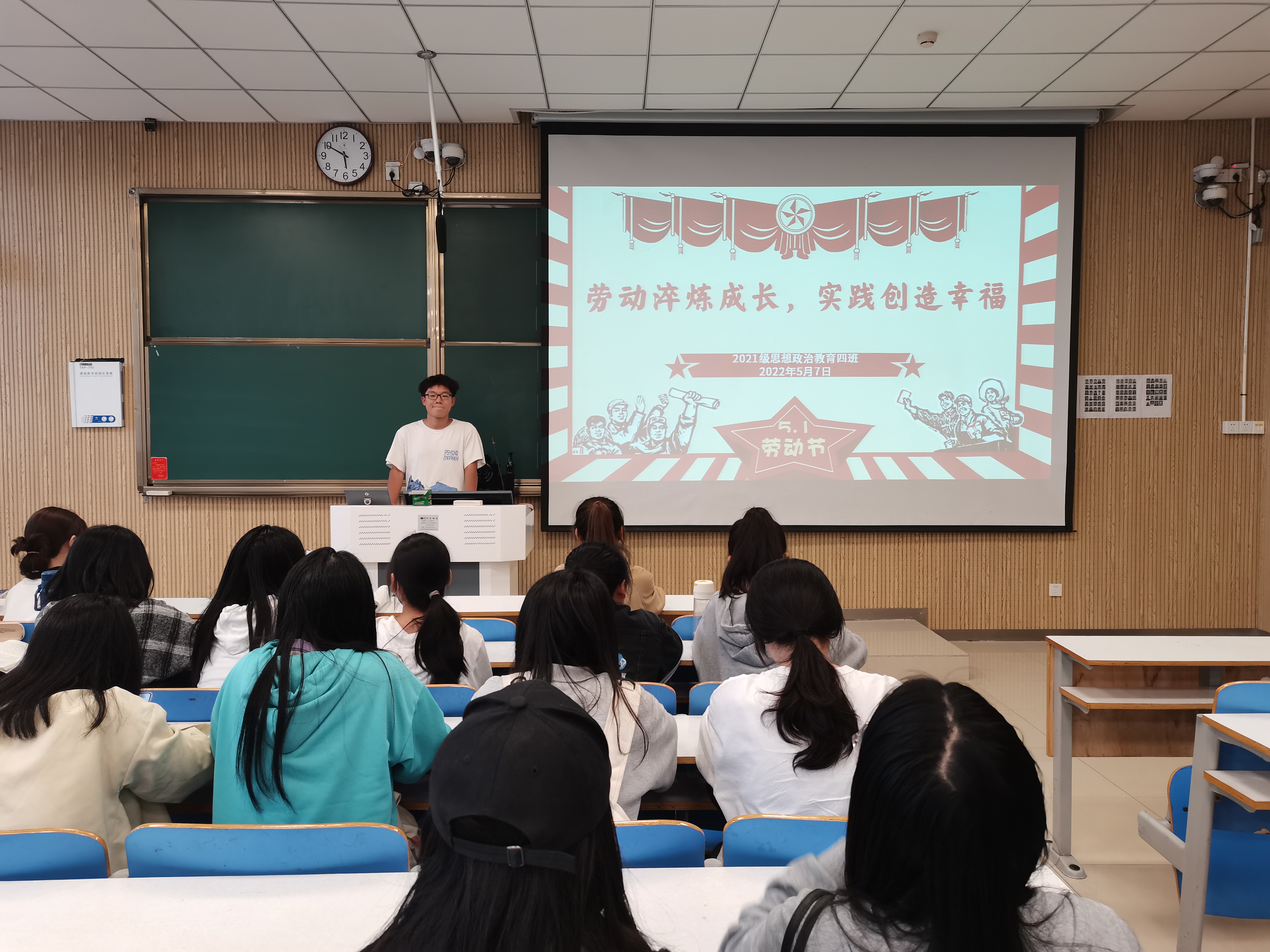 为培养同学们的劳动能力,让劳动精神在青年中发扬光大,5月7日下午,beat365亚洲版官网2021级思想政治教育四班在社科楼515教室开展“劳动淬炼成长,实践创造幸福”主题班会。2021级思想政治教育四班全体同学共同参会。班会由副班长常康哲主持。