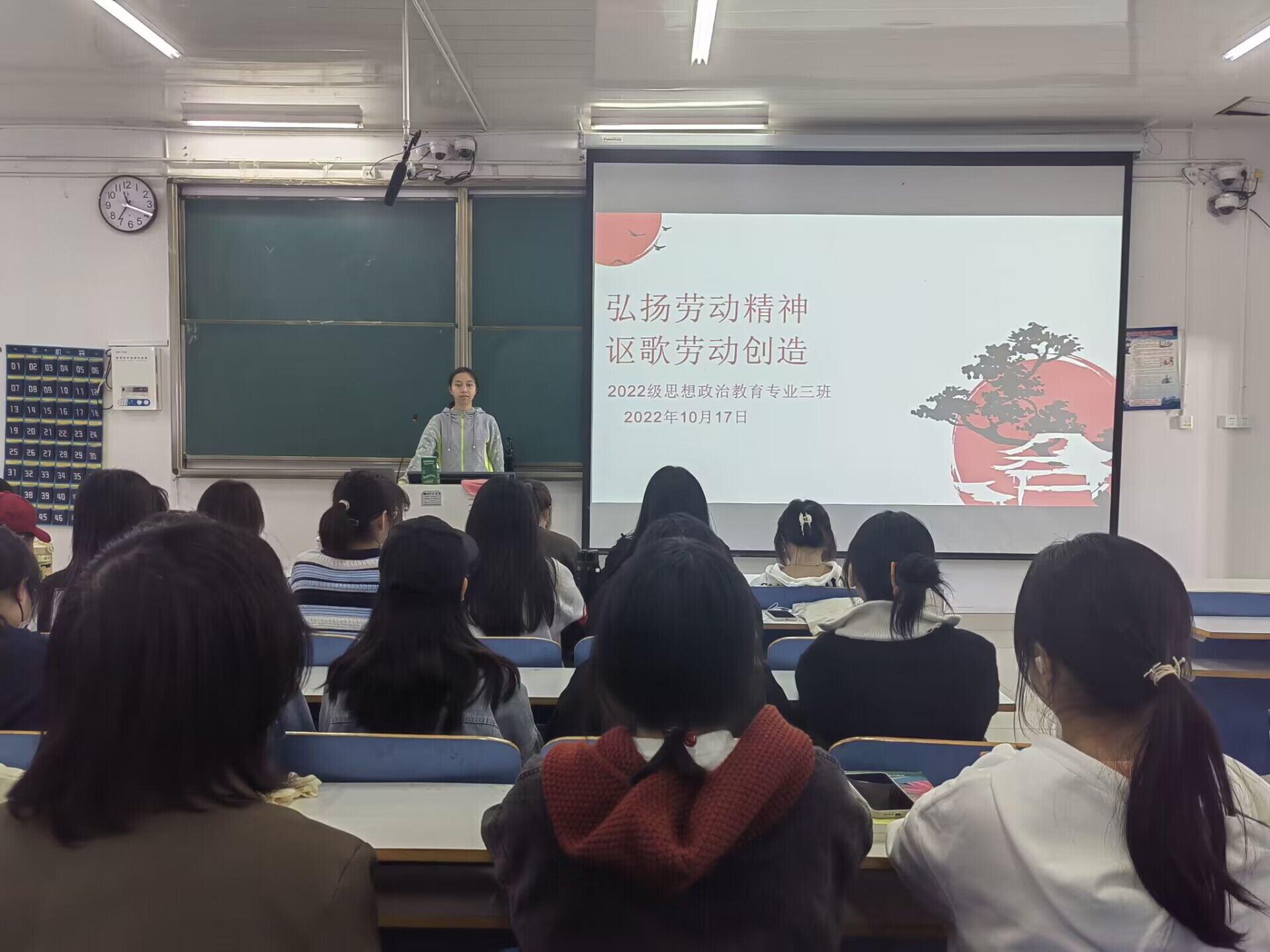 为树立正确的劳动观,切实加强大学生劳动教育,10月17日上午,beat365亚洲版官网2022级思想政治教育三班在社科楼515教室召开“弘扬劳动精神,讴歌劳动创造”主题班会。2022级思想政治教育三班全体成员参加会议,会议由劳动委员郑慧芳主持。