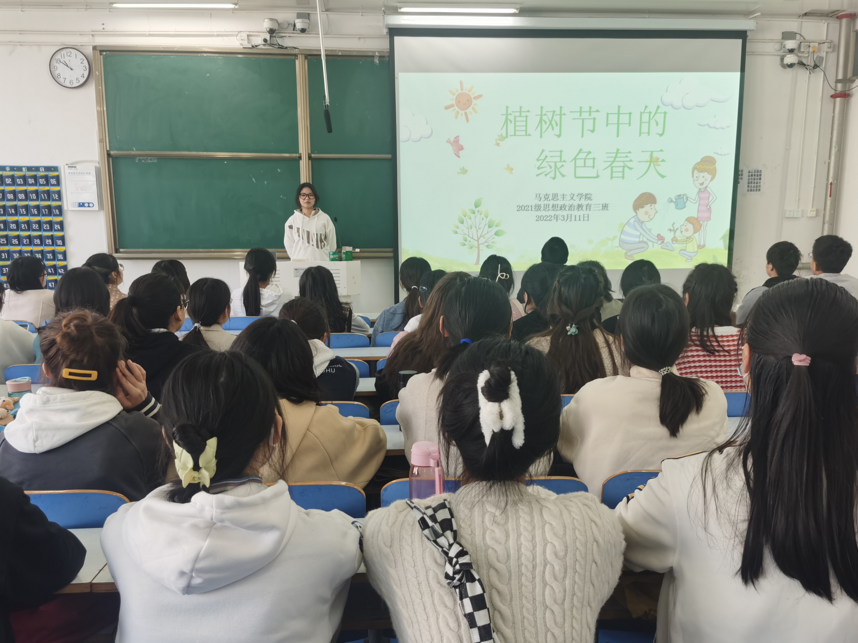 3月9日上午,beat365亚洲版官网2021级思想政治教育三班在社科楼516教室举办“植树节中的绿色春天”主题班会。2021级思想政治教育三班全体成员参加了本次会议。会议由心理委员兼生活委员许竞文主持。