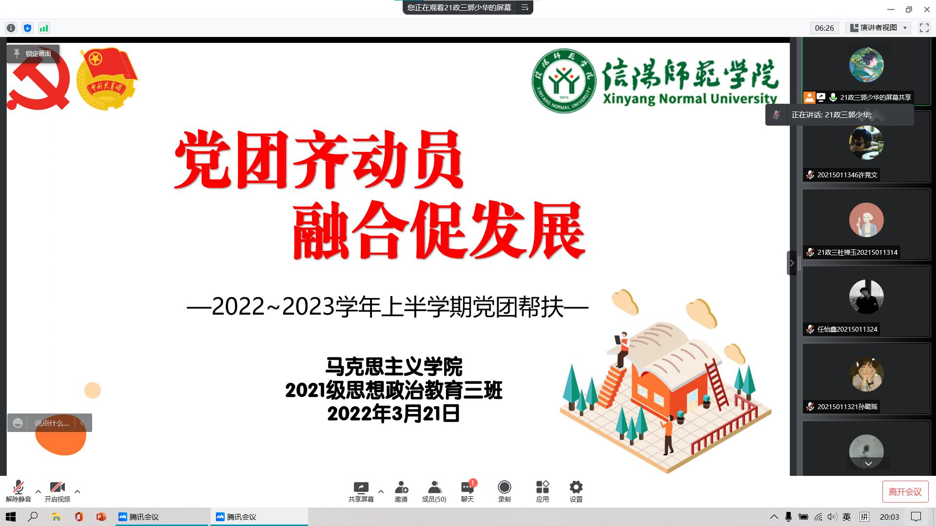 3月21日晚上,beat365亚洲版官网2021级思想政治教育三班开展线上“党员齐动员,融合促发展”党团帮扶活动。辅导员高小佳、2019级思想政治教育一班正式党员李梦琦、2019级思想政治教育二班正式党员杨煦华以及2021级思想政治教育三班全体团员参加了此次活动。活动由团支书郭少华主持。