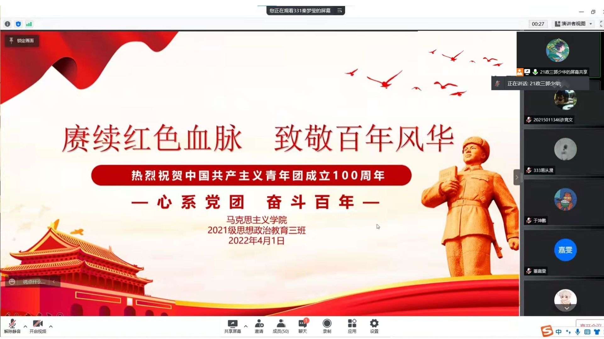 4月1日晚上,beat365亚洲版官网2021级思想政治教育三班召开线上“赓续红色血脉,致敬百年风华”主题团课。2021级思想政治教育三班全体团员参与了此次团课,团课由团支书郭少华主持。