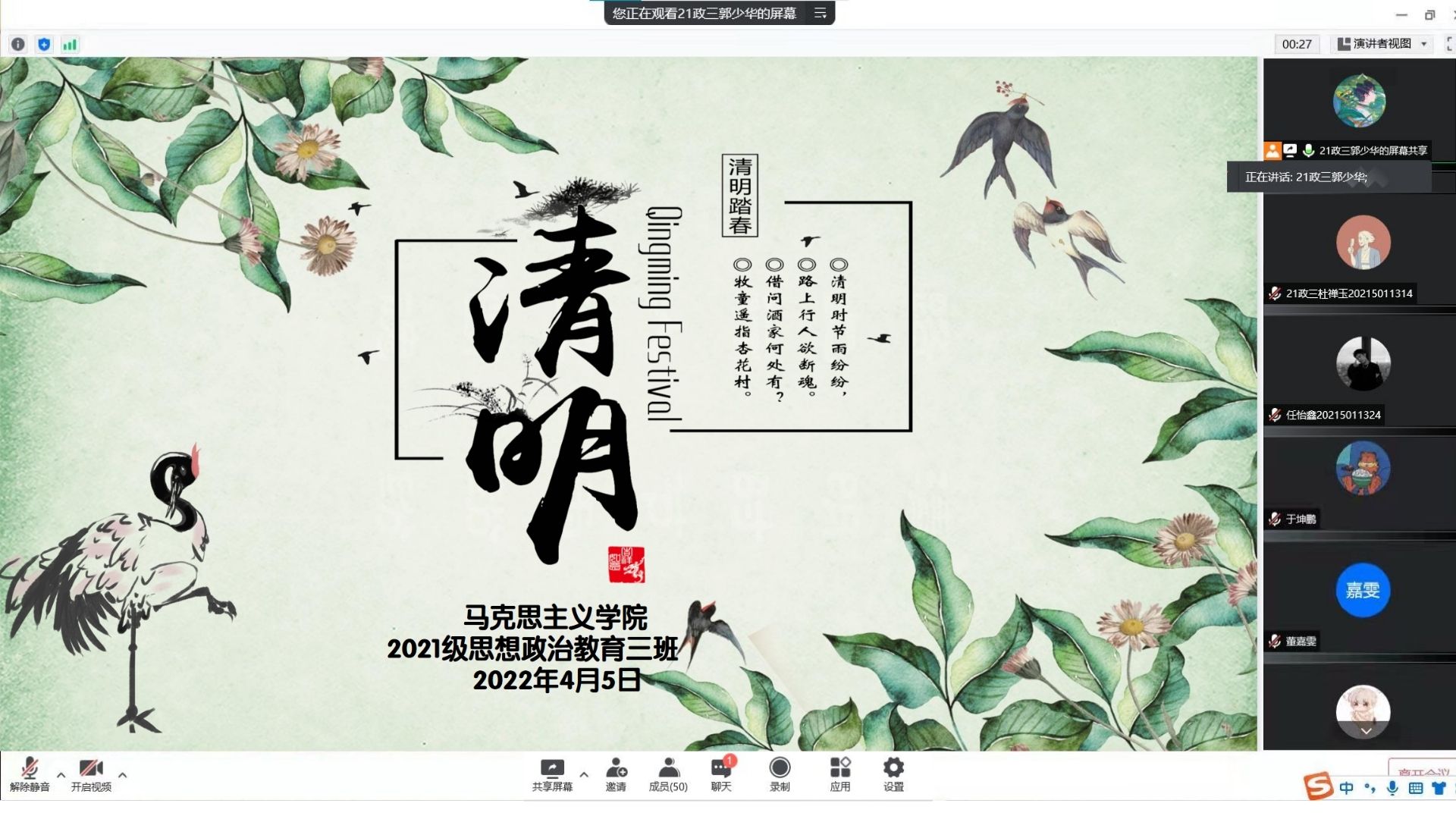 4月5日晚上,beat365亚洲版官网2021级思想政治教育三班召开线上“清明踏春,缅怀先烈”主题团课。2021级思想政治教育三班全体团员参加此次团课。团课由团支书郭少华主持。