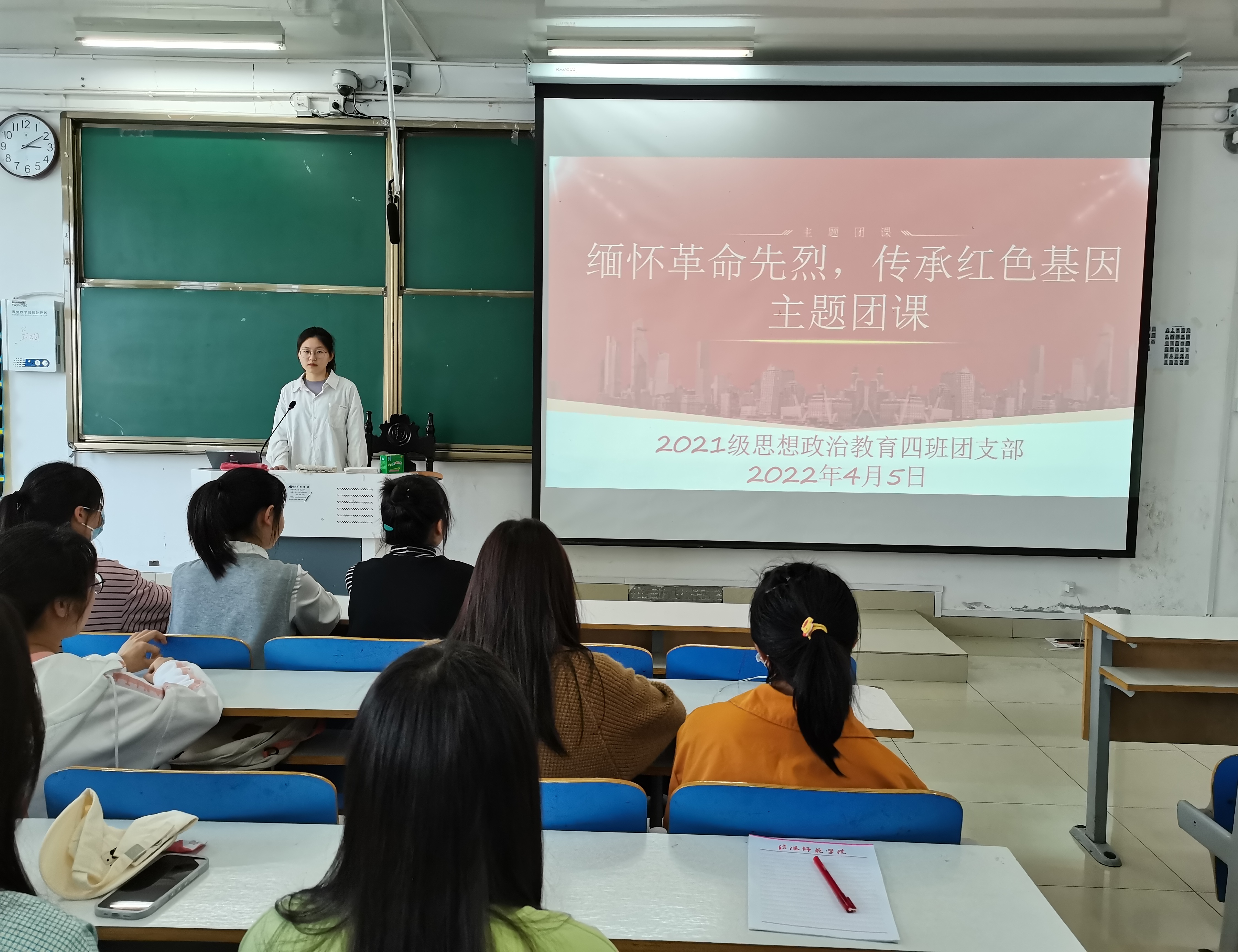 为表达对革命先烈们的崇敬和尊重,传承中华民族精神,4月5日下午,beat365亚洲版官网2021级思想政治教育四班在社科楼516教室开展“缅怀革命先烈,传承红色基因”主题团课。2021级思想政治教育四班全体团员参加本次团课。团课由团支书刘珂含主持。