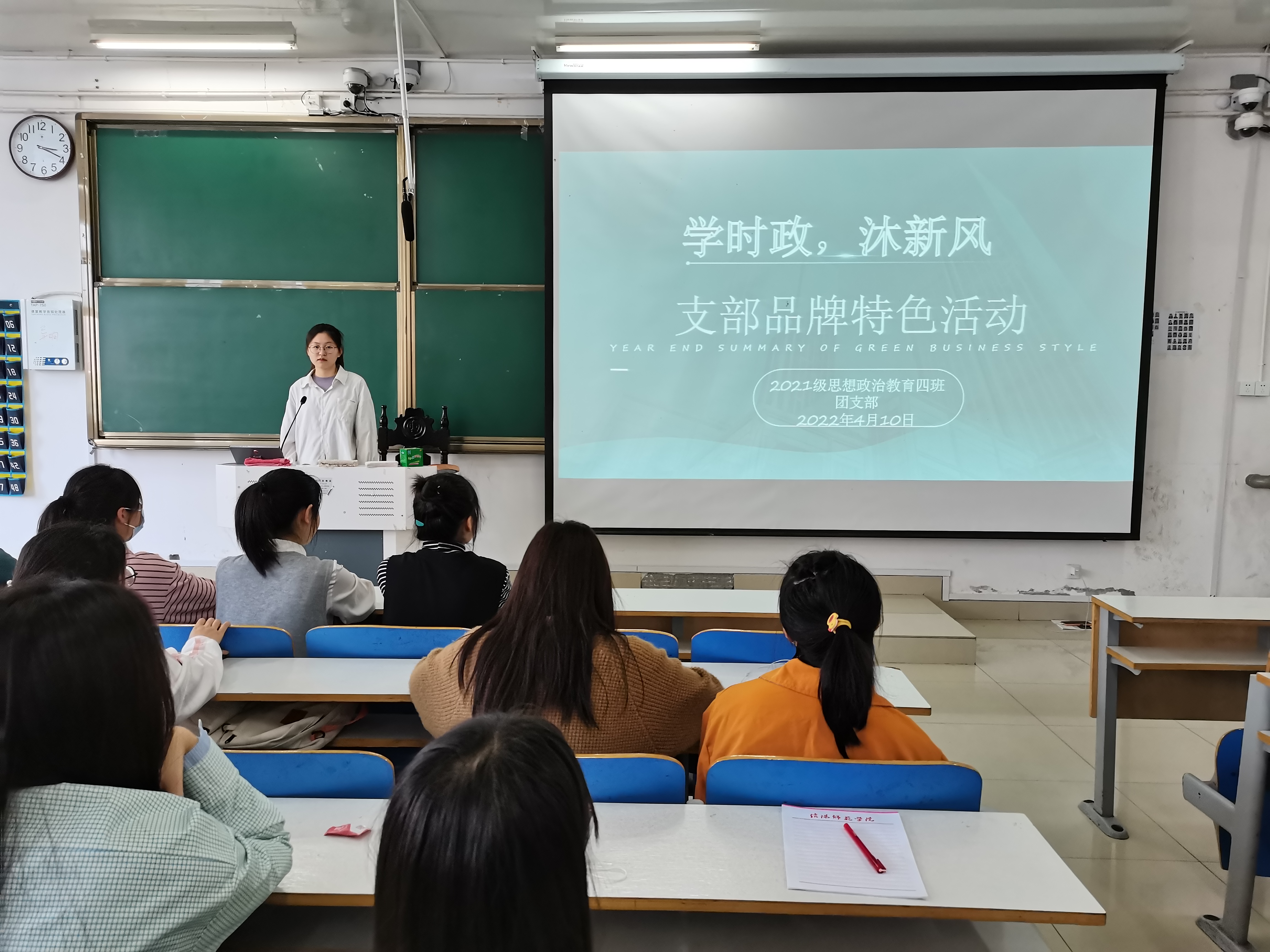 4月10日上午,beat365亚洲版官网2021级思想政治教育四班团支部在社科楼516教室开展“学时政,沐新风”品牌特色活动。2021级思想政治教育四班全体团员共同参与本次活动,活动由团支书刘珂含主持。