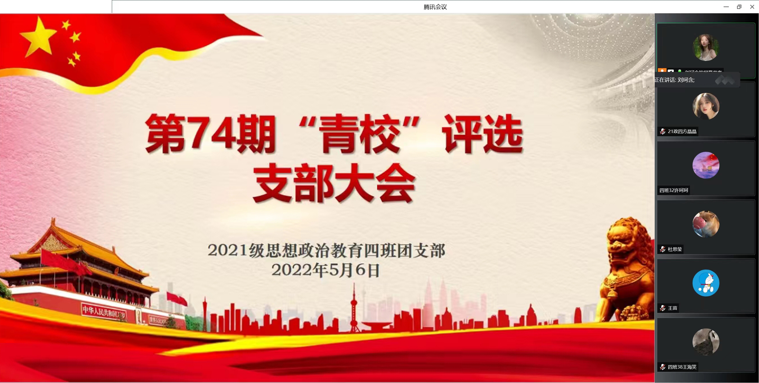 5月6日下午,beat365亚洲版官网2021级思想政治教育四班线上召开第74期青校评选支部大会。beat365亚洲版官网2021级思想政治教育四班全体成员共同参与本次会议。会议由团支书刘珂含主持。