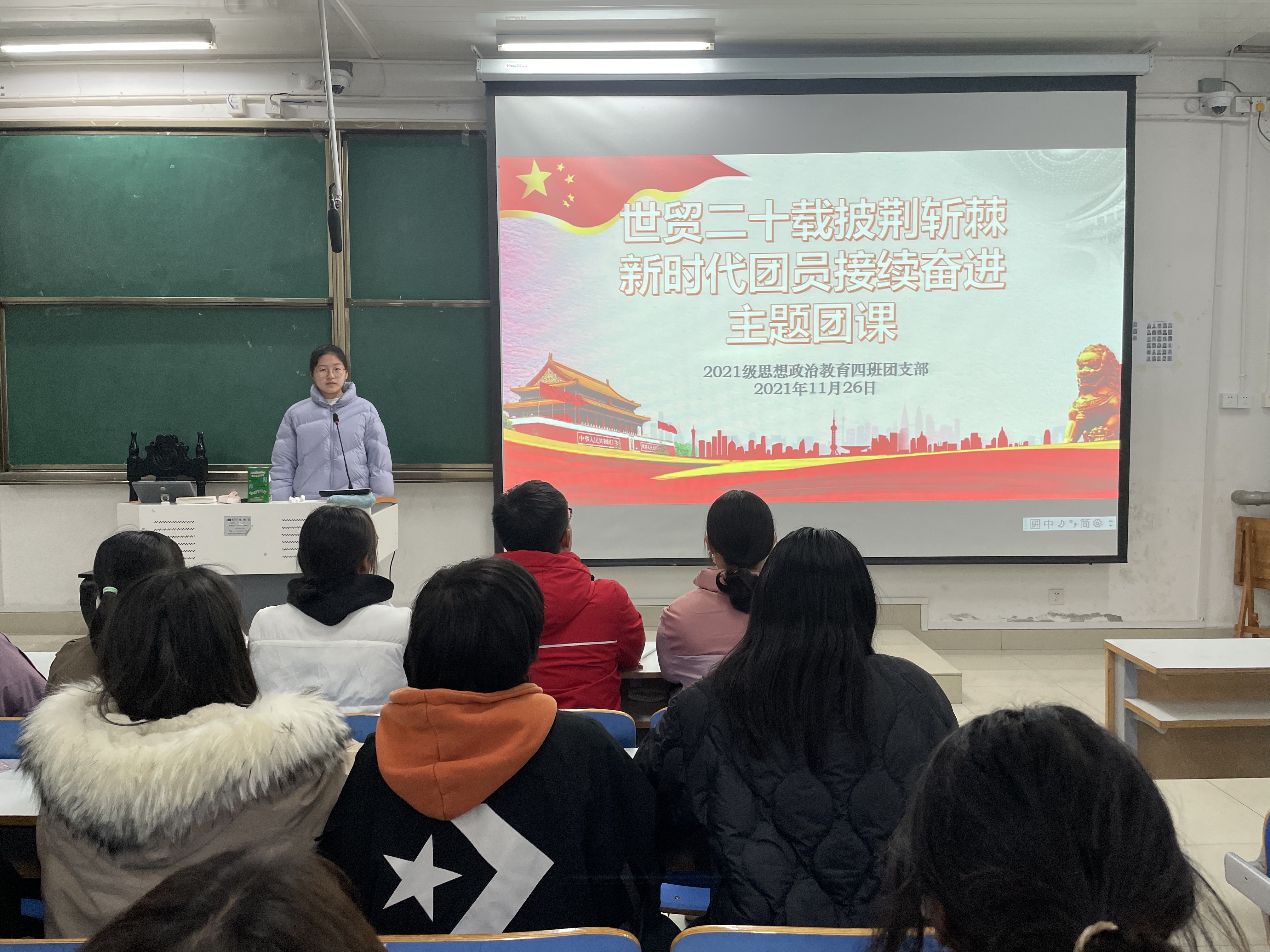 11月26日下午,beat365亚洲版官网2021级思想政治教育四班在社科楼514召开“世贸二十载披荆斩棘,新时代团员接续奋进”主题团课。2021级思想政治教育四班全体团员参加本次主题团课,团课由团支书刘珂含主持。