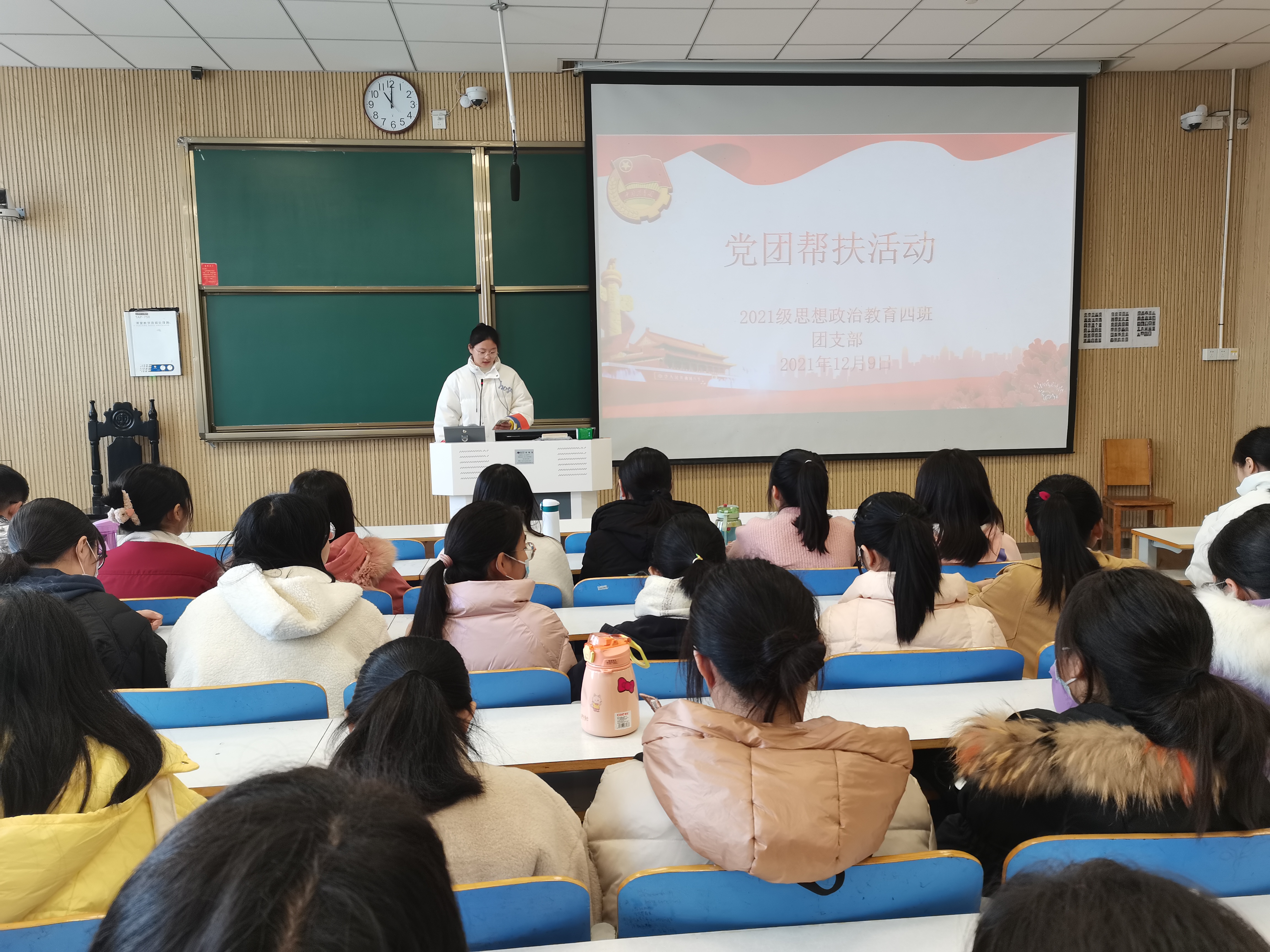 12月9日上午,beat365亚洲版官网2021级思想政治教育四班在社科楼515教室召开党团帮扶活动。辅导员高小佳、2018级思想政治教育一班的李东琴、韩一嘉及2021级思想政治教育四班全体团员参加此次活动。活动由团支书刘珂含主持。