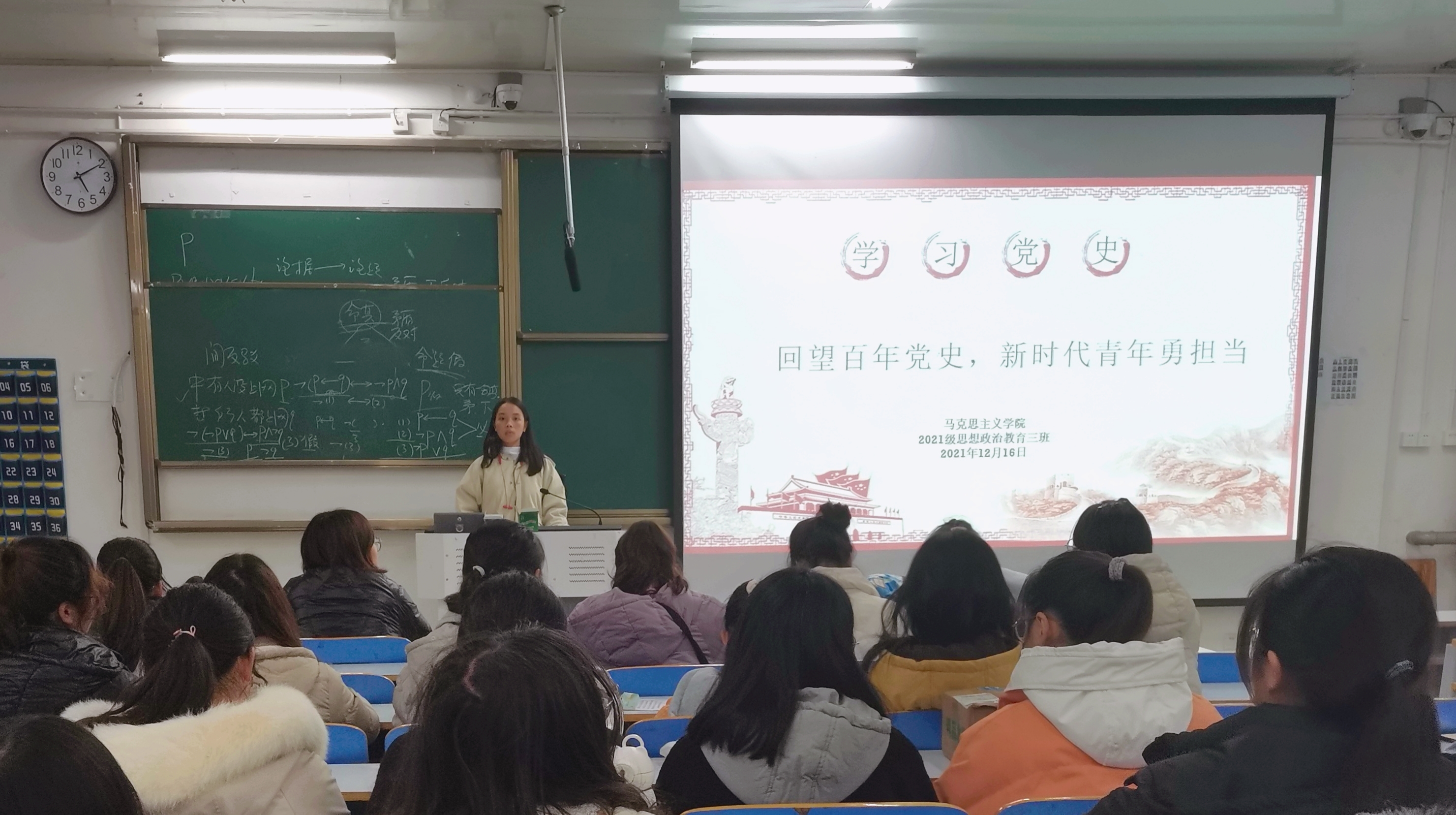 12月16日下午,beat365亚洲版官网2021级思想政治教育三班在社科楼514教室举办“回望百年党史,新时代青年勇担当”主题团课。2021级思想政治教育三班全体团员参加了此次团课。团课由团支部副书记王岚霄主持。
