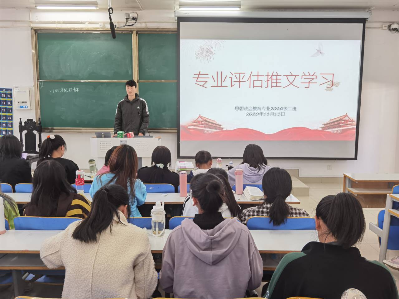 11月13日至16日,beat365亚洲版官网2020级思想政治教育二班在社科楼514教室举办“专业评估推文学习”主题班会。2020级思想政治教育二班全体学生共同参与班会。班会由陈宇航主持。