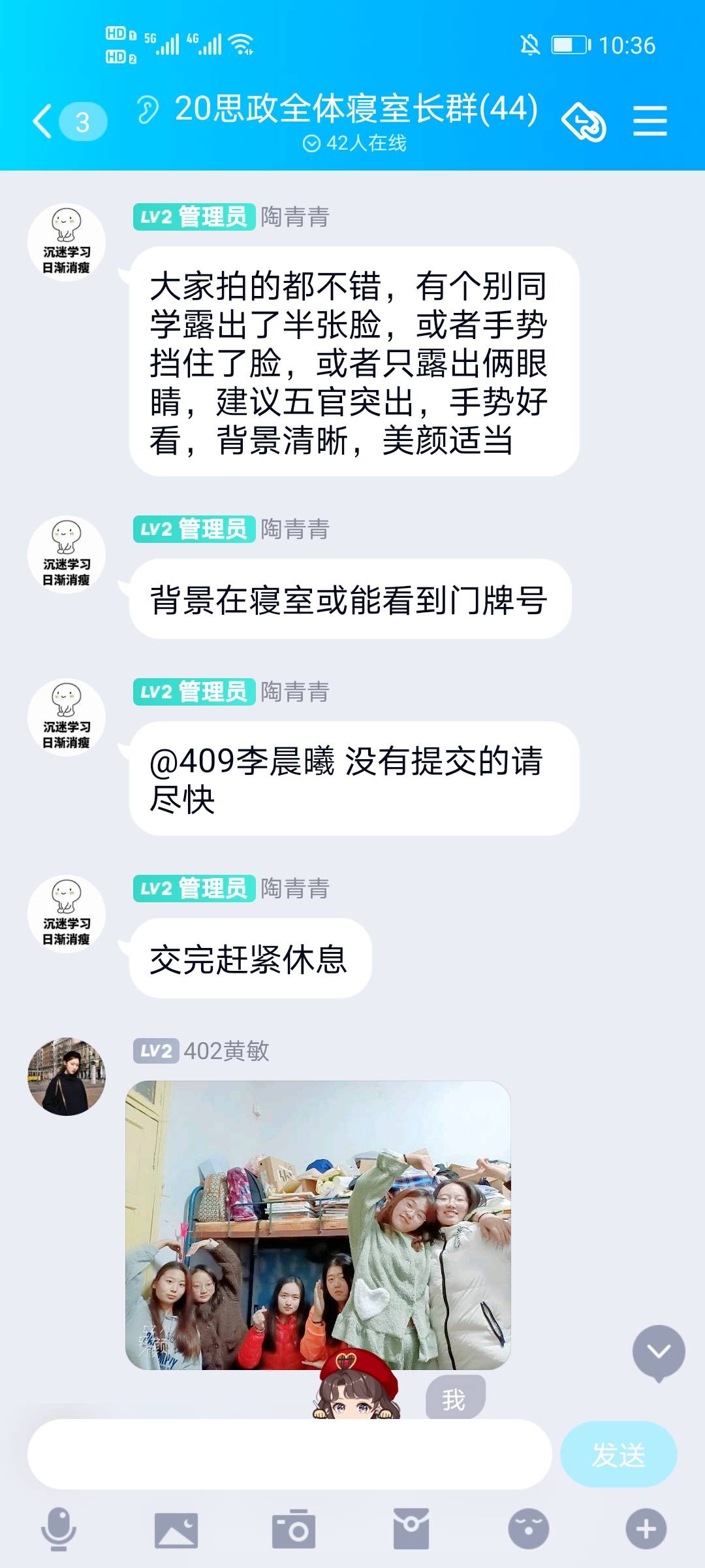首先,我班各寝室负责人就开学以来各自宿舍的安全隐患、室友关系等多方面情况向班主任陶青青作出详细汇报。随后,陶青青老师通过视频电话的方式与部分同学进行了亲切交谈。在谈话中她问到“室友关系好不好”,“用水用电便不便”,“安全保障全不全”三个问题。她表示,各位同学要在生活中互帮互助,积极培养与维护和睦的宿舍关系;要注重宿舍卫生状况,做到勤打扫、勤通风;入冬以来,宿舍不安全因素明显增加,各位同学要牢固树立安全意识,自觉参与宿舍安全隐患排查活动。最后,她强调,寝室负责人作为寝室的表率与主心骨,肩负着保障宿舍安全的重要责任,要主动作为,勇于担当,积极团结室友,为营造一个安全温馨的宿舍氛围作出应有贡献。