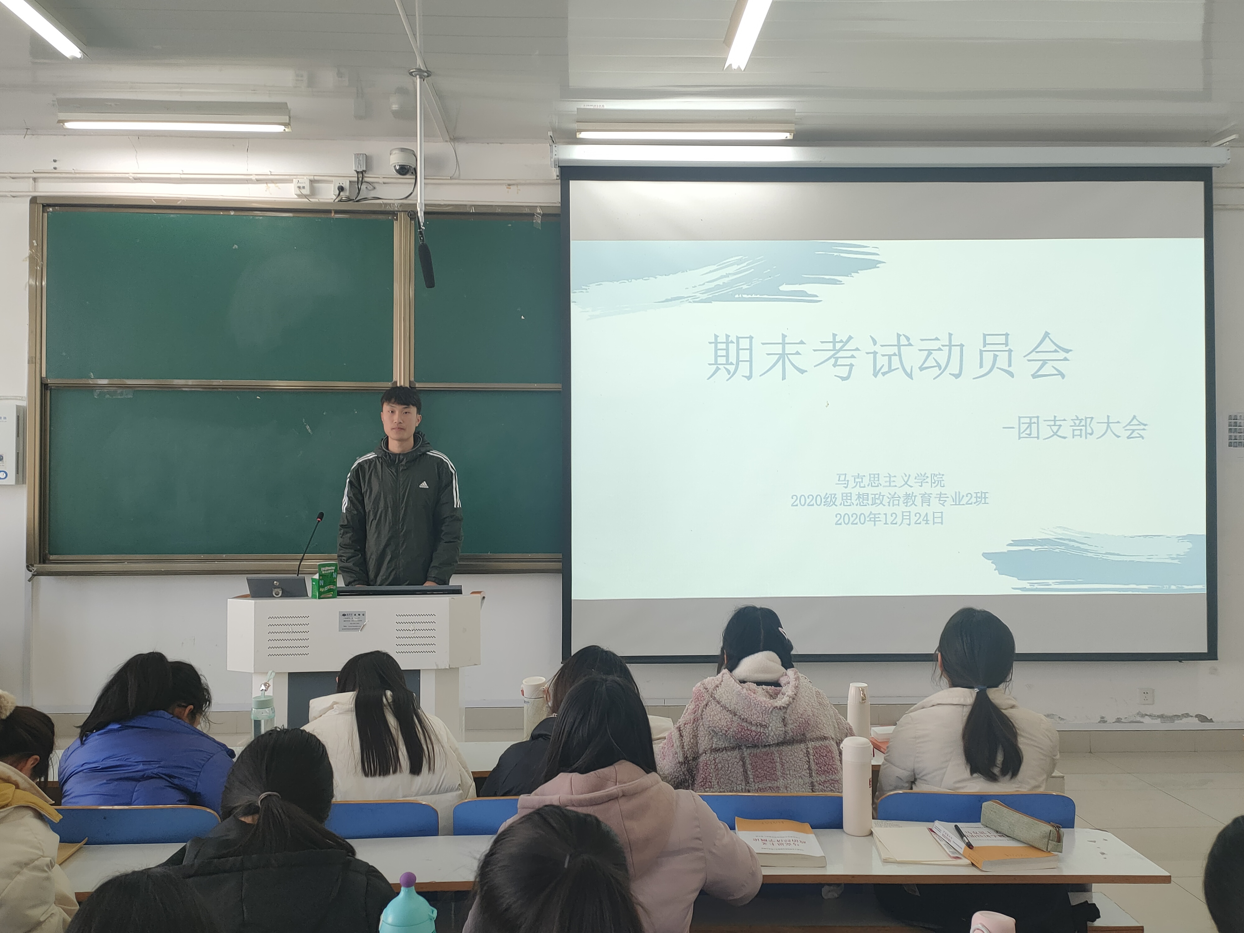 12月24日上午,beat365亚洲版官网2020级思想政治教育二班、(定向)二班在社科楼516教室顺利召开期末考试动员会。2020级思想政治教育二班、(定向)二班全体学生共同参与此次会议。会议由李晨曦、陈宇航主持。