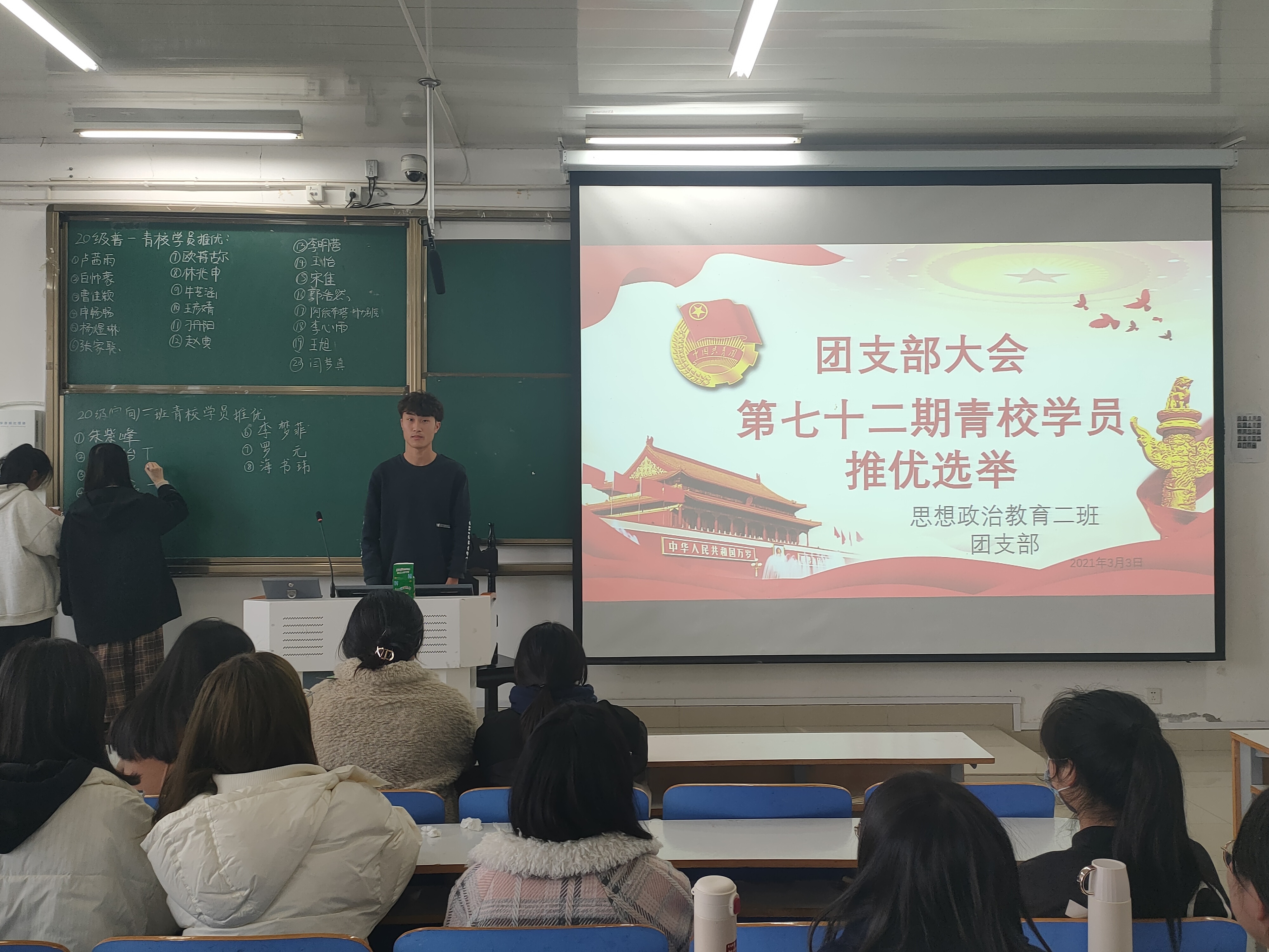 3月3日下午,beat365亚洲版官网2020级思想政治教育二班第72期青校学员推优选举团支部大会在社科楼516教室顺利召开。此次推选秉承公平公正公开原则,邀请生活委员刘晶晶作为检票员、我班全体未参与推选同学组成选举团。推选大会由团支书陈宇航主持。