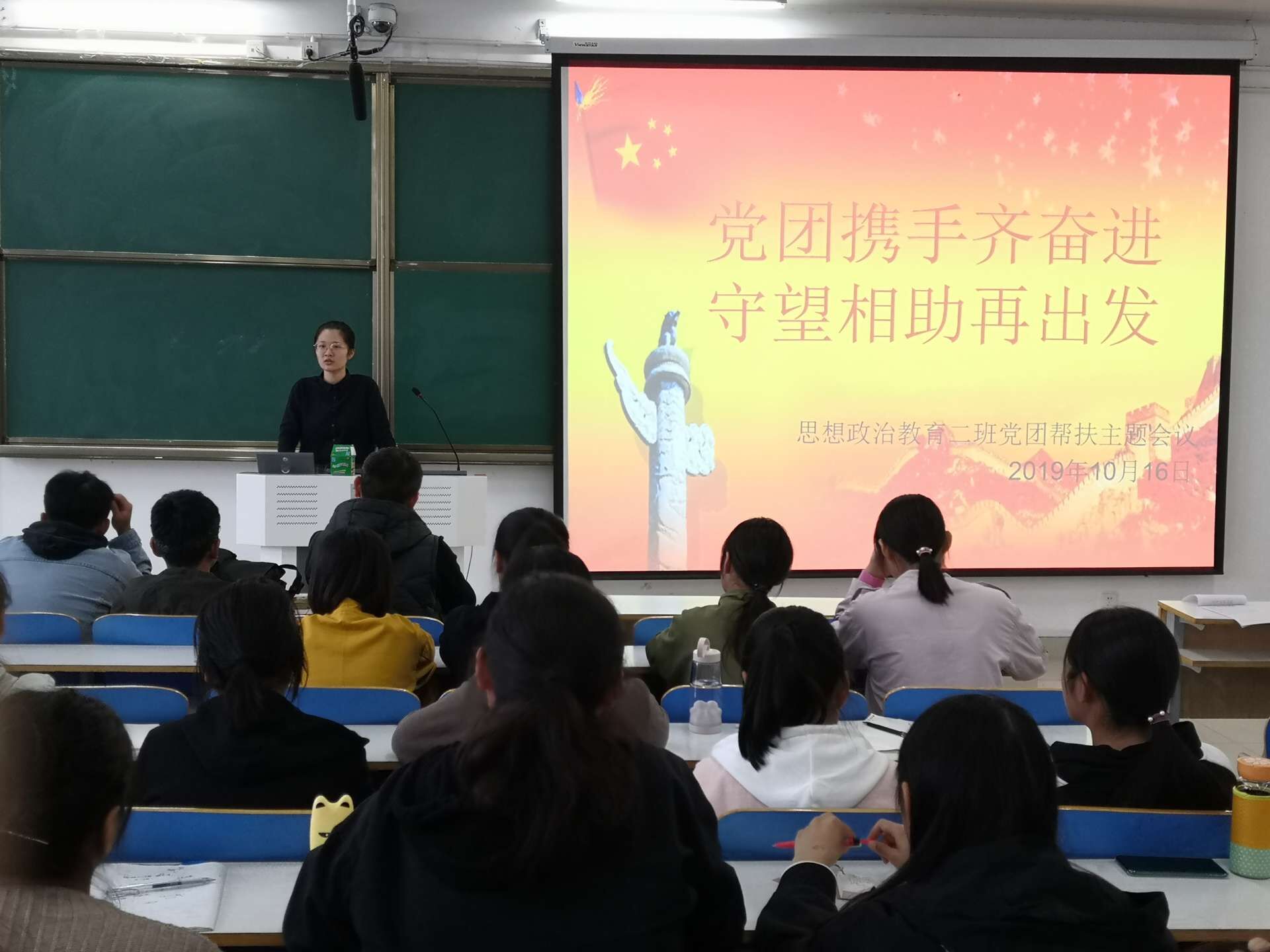 为提高2019级新生适应大学校园生活的能力,10月16日上午,beat365亚洲版官网2019级思想政治教育二班在社科楼514教室顺利开展党团帮扶班会。党团帮扶小组成员张雅琼、刘冰以及2019级思想政治教育二班全体同学共同参会。本次班会由团支书孙雅娴主持。