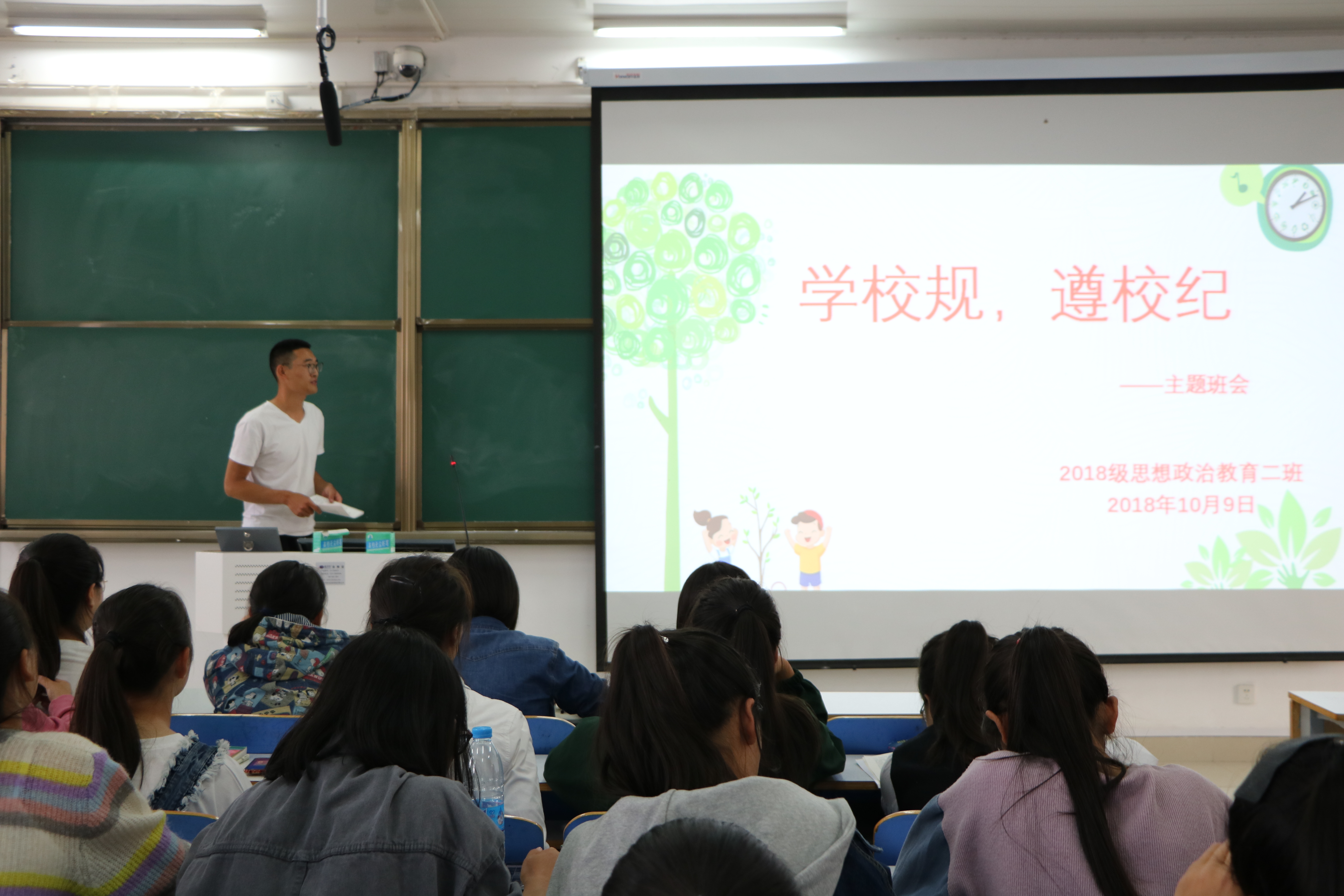 为引导beat365官网新生严格遵循校规校纪,自觉规范个人行为,10月9日上午,beat365官网2018级思想政治教育二班在社科楼514教室召开“学校规,遵校纪”主题班会。2018级思想政治教育二班全体同学共同参加本次班会。班会由班长杨康主持。