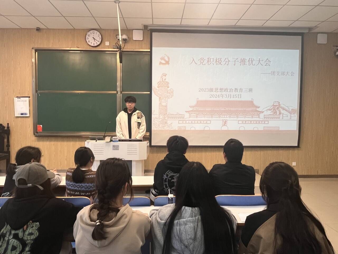 为加强党的队伍建设,充实党的新生力量,3月15日上午,beat365亚洲版官网2023级思想政治教育三班在社科楼515教室举行入党积极分子推优大会。beat365官网2023级思想政治教育三班全体成员共同参加此次班会,班会由团支书郝瀚主持。