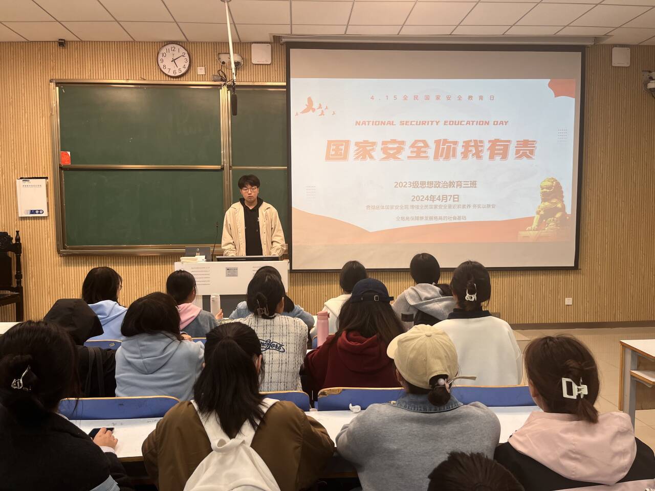 为深入贯彻总体国家安全观,进一步增强学生国家安全和法治意识,培养学生的爱国情怀,4月7日下午,beat365亚洲版官网2023级思想政治教育三班在社科楼515教室举行“国家安全你我有责”主题班会。beat365官网2023级思想政治教育三班全体成员共同参加此次班会,班会由团支书郝瀚主持。