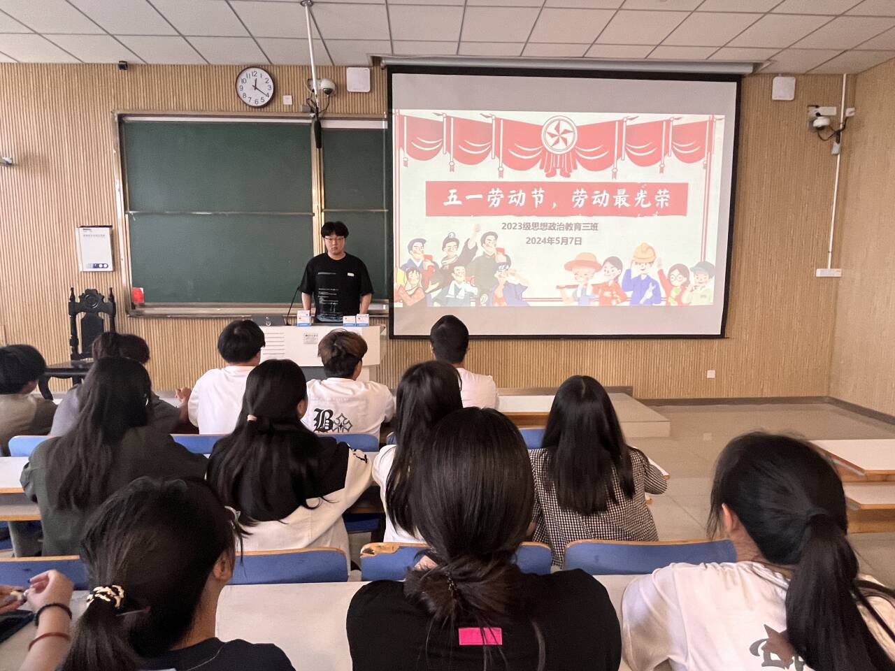 为弘扬劳模精神,发扬劳动传统,5月7日上午,beat365亚洲版官网2023级思想政治教育三班在社科楼515召开“五一劳动节,劳动最光荣”主题班会。beat365官网2023级思想政治教育三班全体同学共同参与本次班会,班会由团支书郝瀚主持。