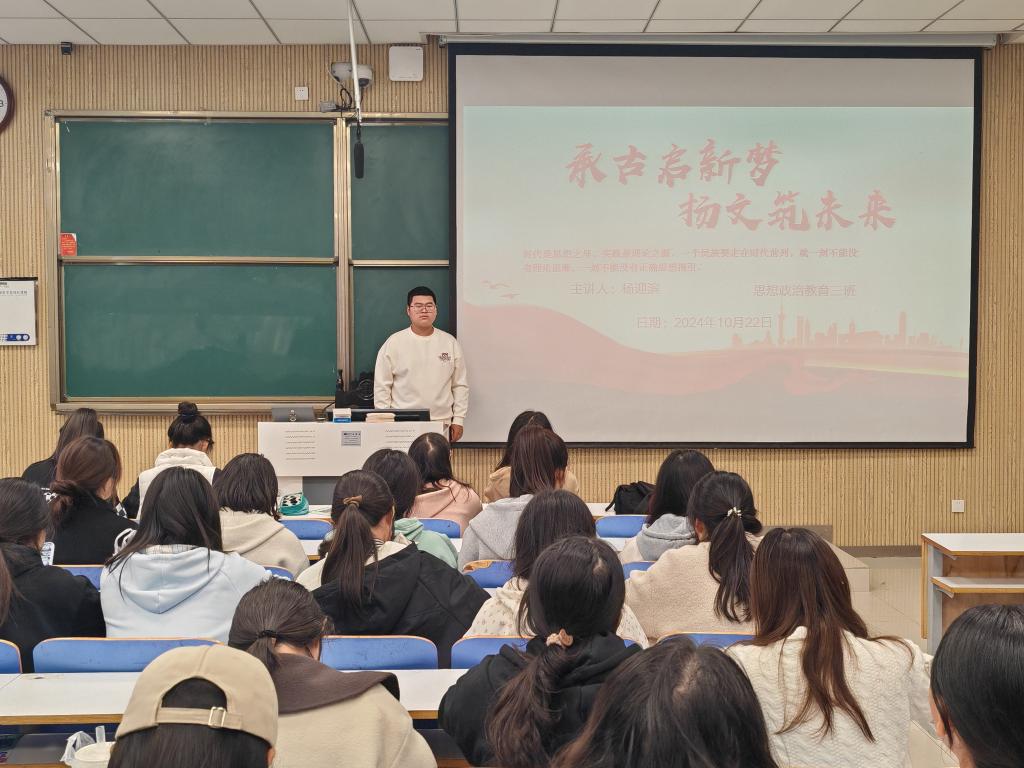 为了深入学习习近平文化思想,加强政治认同,增强文化自信,beat365亚洲版官网2024级思想政治教育三班于10月22日上午举办“承古启新梦,扬文助未来”主题团课活动。本次团课活动由团支书杨迎滨主持。