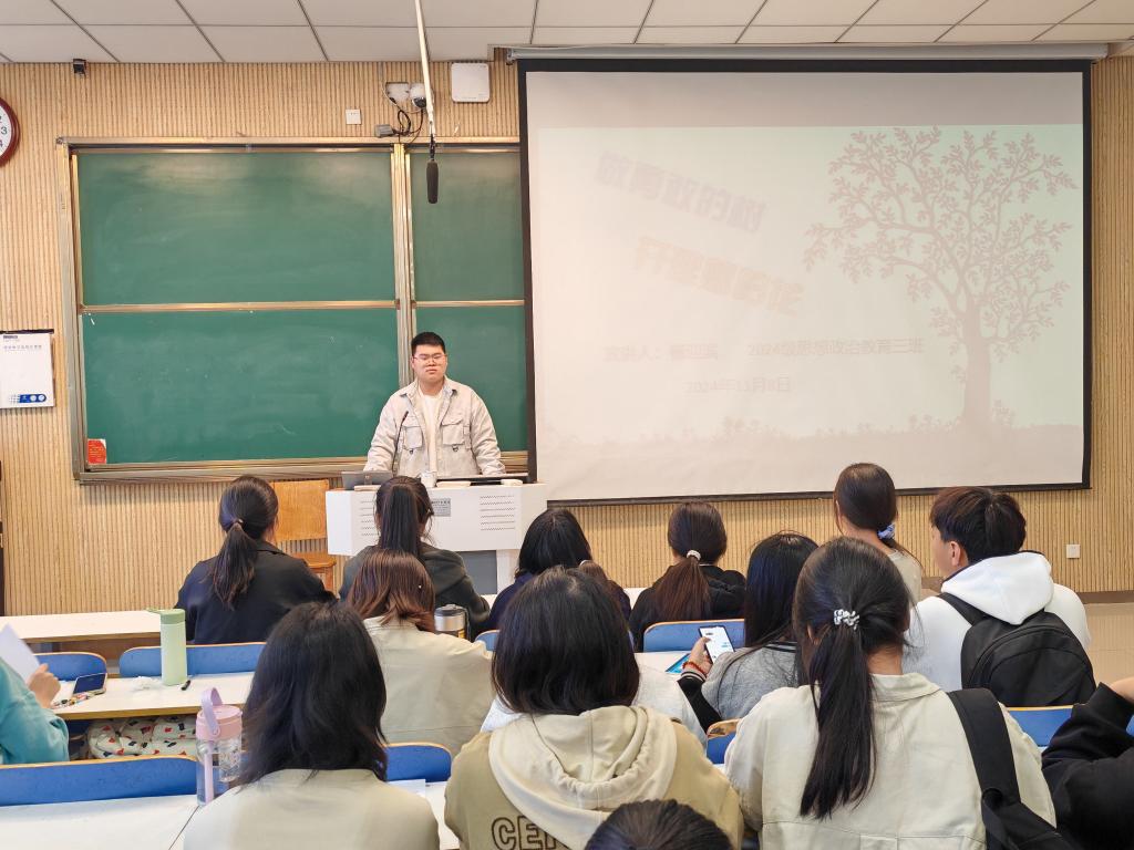 为了激励同学们勇敢的面对挑战,坚定的追求自己的理想,beat365亚洲版官网2024级思想政治教育三班于11月8日在社科楼515教室成功举办了一场以“做勇敢的树,开理想的花”为主题的班会活动。此次班会由班长杨迎滨主持。