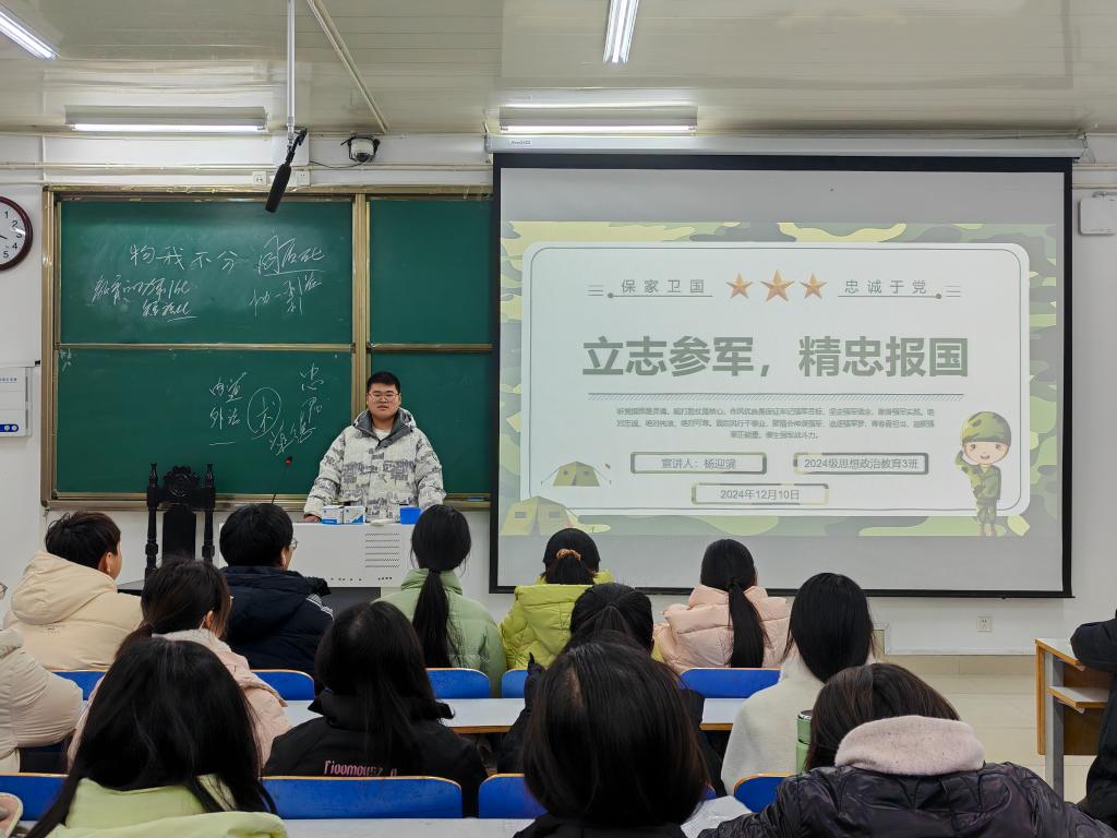 为积极响应国家号召,增强青年学生的国防意识与爱国情怀,beat365亚洲版官网2024级思想政治教育三班于12月10日在社科楼514教室成功举办了以“立志参军,精忠报国”为主题的班会活动。此次班会由班长杨迎滨主持。
