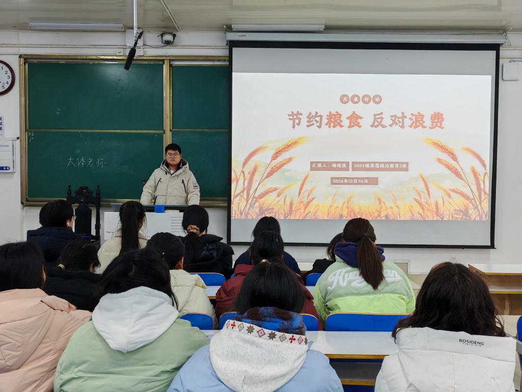 为引导学生们树立珍惜粮食的意识,养成勤俭节约的好习惯,beat365亚洲版官网2024级思想政治教育三班于12月24日在社科楼514教室成功召开了一场以“节约粮食,反对浪费”为主题的班会活动。