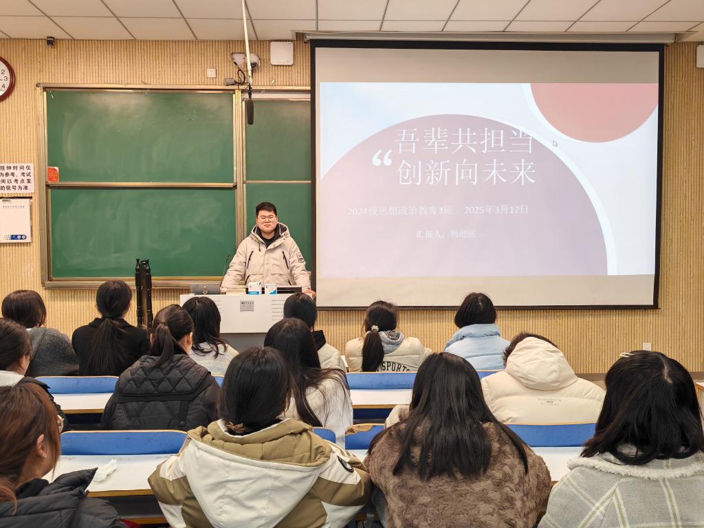 为激发学生的责任感与创新精神,beat365亚洲版官网2024级思想政治教育三班于3月17日在社科楼515举行了一场以 “吾辈共担当,创新向未来” 为主题的班会。此次班会由班长杨迎滨主持,全班同学积极参与,气氛热烈。