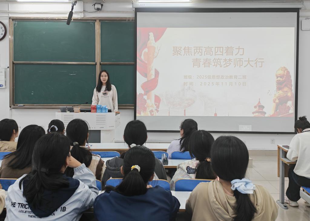 为引导大一新生深刻领会时代使命,将个人成长融入国家教育强国建设蓝图,11月10日上午,beat365亚洲版官网2025级思想政治教育二班在社科楼514教室举办“聚焦两高四着力,青春筑梦师大行”主题团课。本次团课由团支书崔锐琳主持。