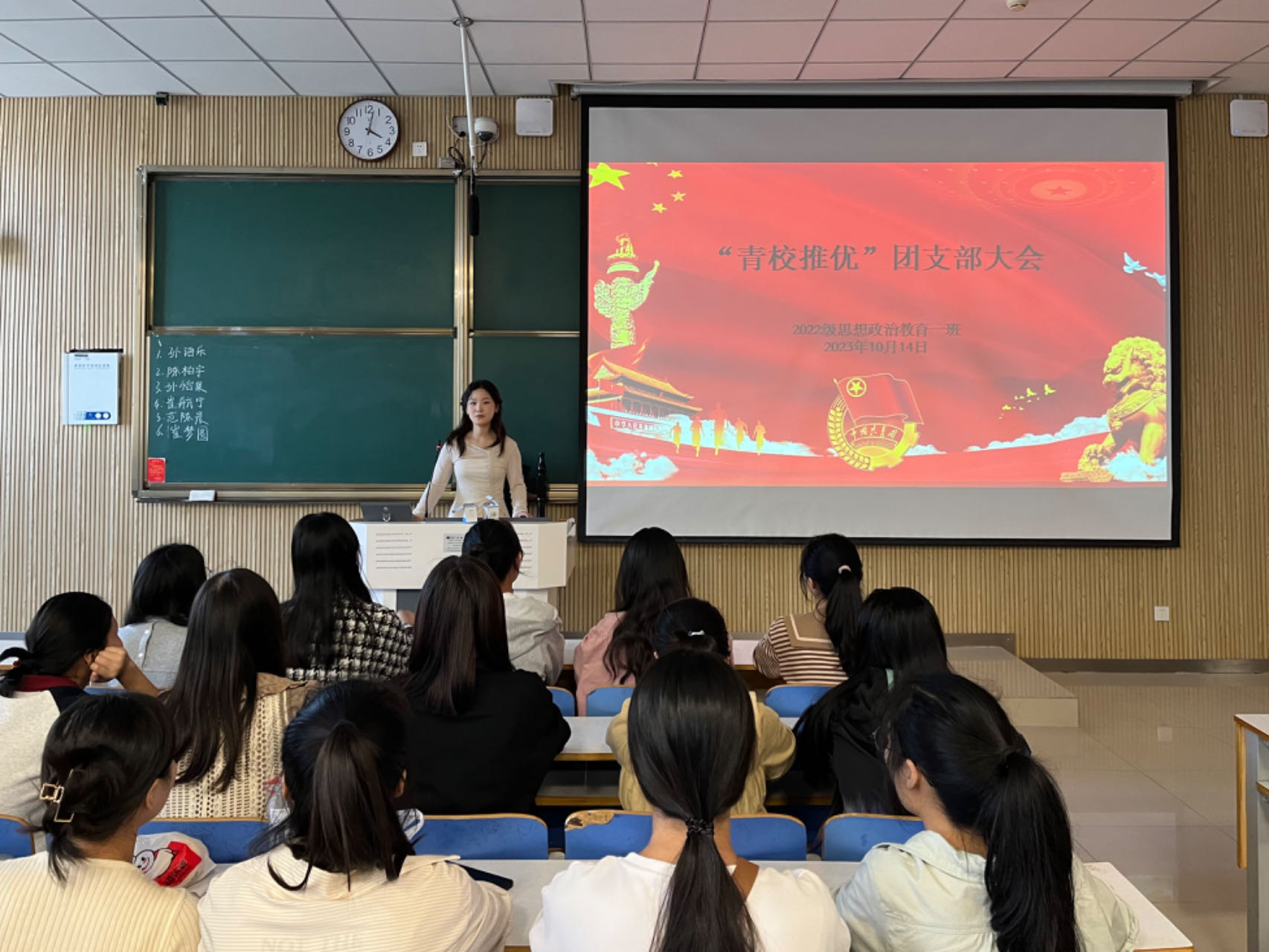 本次会议共分为青校介绍、竞选者发言和现场投票三部分内容。首先,李佳茹指出,青年共产主义学校旨在适应时代发展的要求,以理论学习与社会实践、卷面考试与撰写论文、个人自学与集体交流相结合的教学方式,让广大同学系统地接受共产主义教育服务。接着,六位竞选者依次上台,从个人情况、入党动机、现实表现和努力方向等方面进行演讲。他们表示,作为共青团员要不断提升对党的基本理论、基本路线、基本方略的领悟力,深学细悟党的创新理论,树立共产主义远大理想,努力向党靠拢。随后,李佳茹组织同学们进行现场投票,得出评选结果。最后,她对本次团支部大会作出总结,青年团员应强化理想信念,积极进行理论学习与社会实践,在强国建设、民族复兴的历史潮流中确立正确的人生目标,切实肩负起新时代新征程党赋予的使命任务。