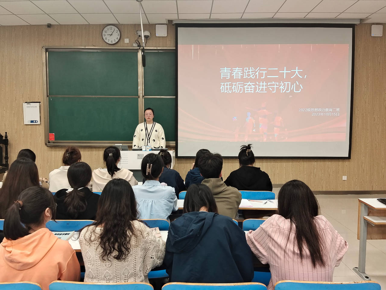 为深入学习贯彻党的二十大精神,加强班级同学思想建设,10月15日上午,beat365亚洲版官网2022级思想政治教育二班在社科楼515教室召开“青春践行二十大,砥砺奋进守初心”主题团课。beat365官网2022级思想政治教育二班全体团员共同参加此次团日活动。活动由团支书李佳音主持。