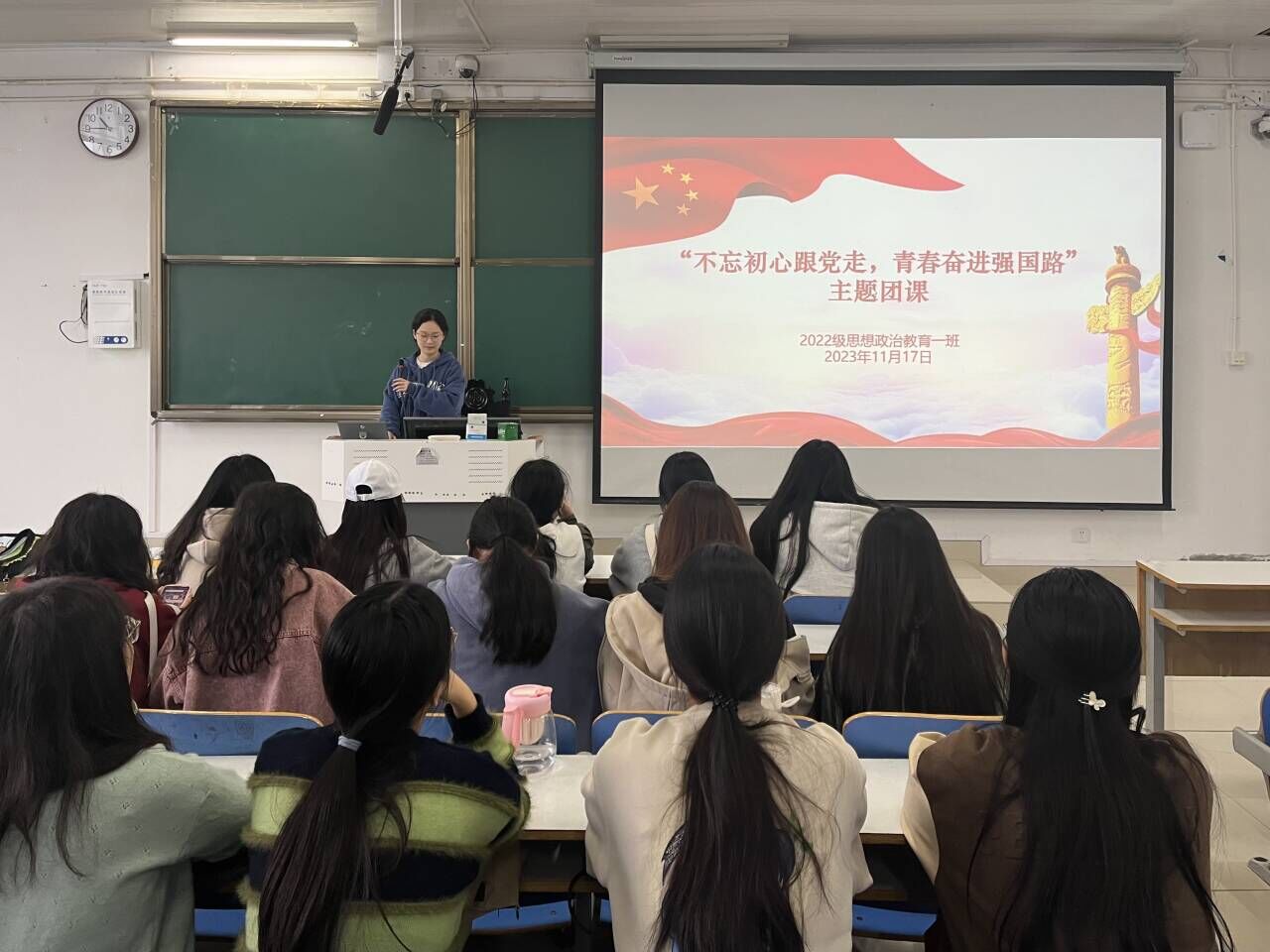 为激励广大青年的奋进力量,11月17日上午,beat365亚洲版官网2022级思想政治教育一班在社科楼514教室召开“不忘初心跟党走,青春奋进强国路”主题团课。beat365官网2022级思想政治教育一班全体同学共同参与本次团课,团课由团支书李佳茹主持