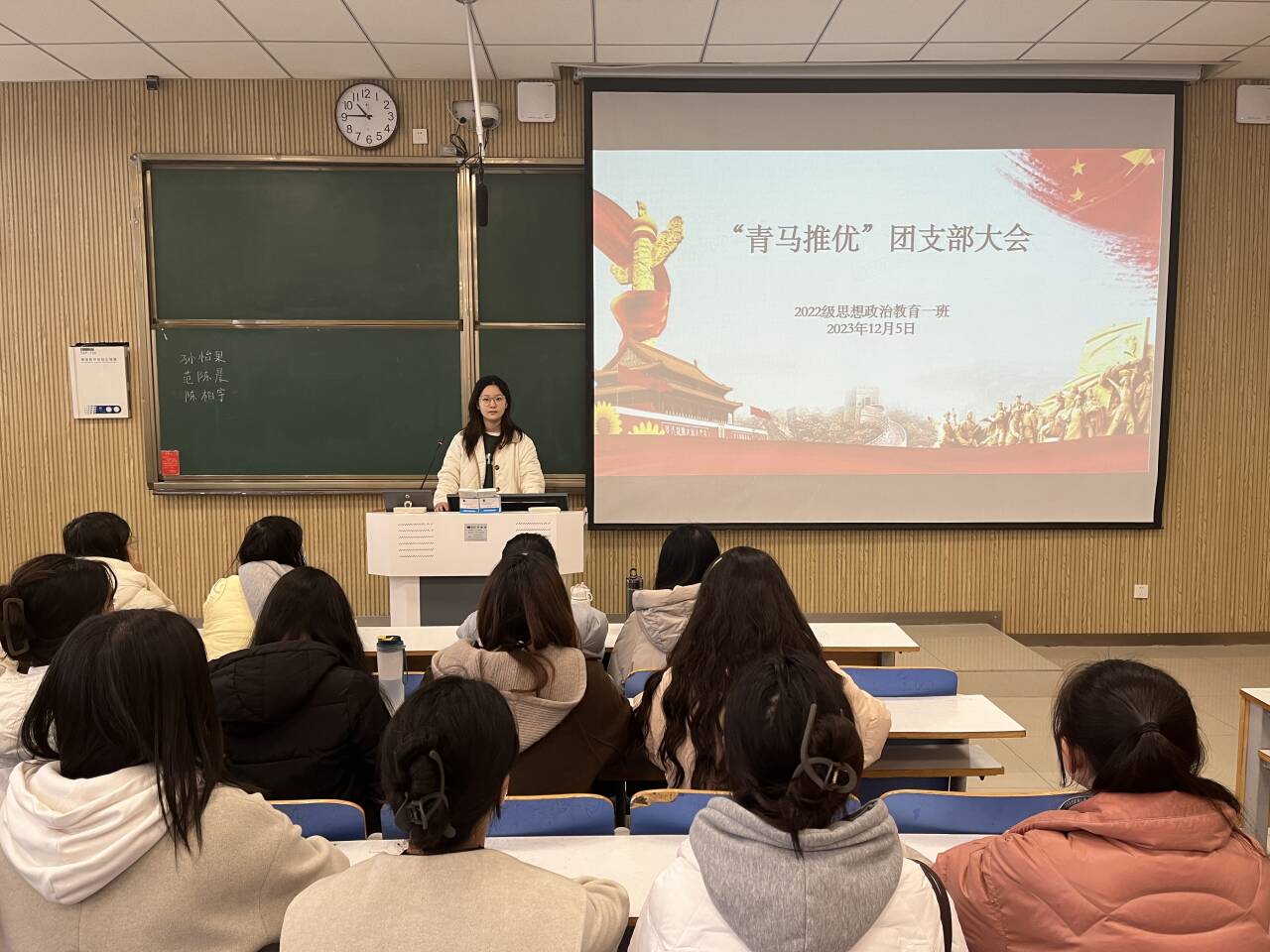 本次大会围绕竞选人发言、投票统计和大会总结三部分内容展开。首先,李佳茹讲述本次青马工程评选要求,并指出青马工程旨在为党培养信仰坚定、能力突出、素质优良、作风过硬的青年政治骨干,并通过教育培训和实践锻炼等方式提高青年大学生的思想政治素质、政策理论水平和实践能力等。接着,三位候选人依次上台,围绕个人基本情况、入选动机、个人努力与成绩等方面展开演讲,展现出锐意进取的精神风貌和爱党、爱国、爱团的真切情感。随后,现场团员进行投票,由班委进行公开计票并公布结果。最后,李佳茹向同学们提出三点建议:一是厚实理论基础,学习掌握党的理论创新成果,提高思想政治素质;二是进行实践锻炼,积极参与相关活动,强化社会责任意识,坚定为社会主义现代化强国建设奋斗终身的信念;三是拓展视野,既要看到书本里的知识,又要看到社会中的学问,推进知识创新、理论创新和方法创新。