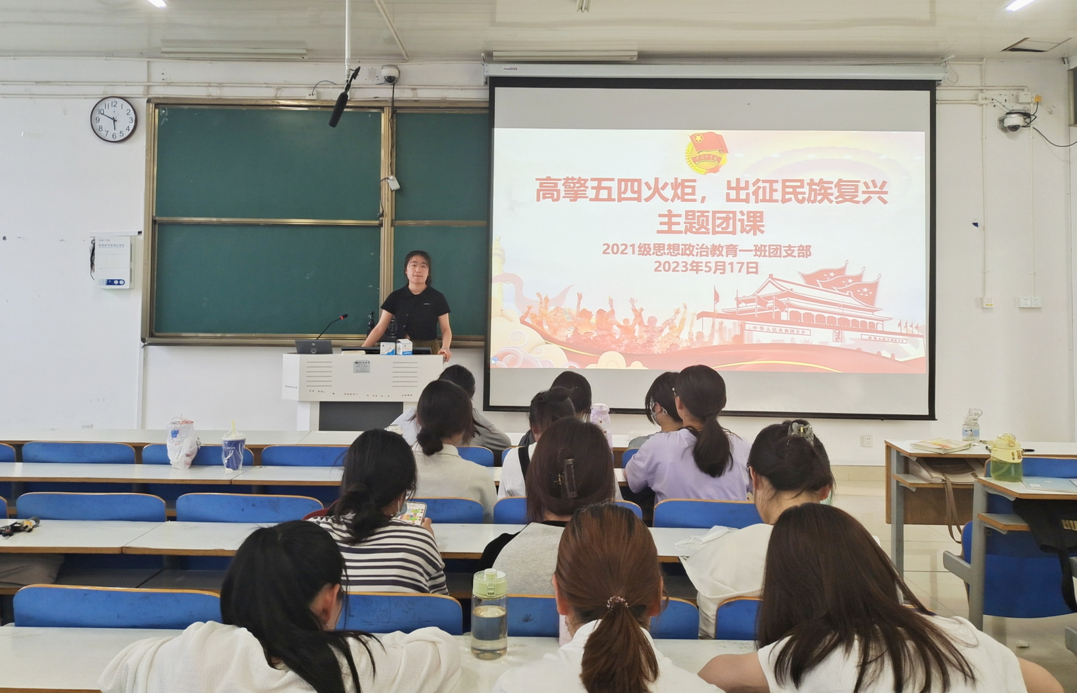 团课伊始,雷敏强调,本次团课重在引领我班团员深入了解五四精神,凝聚青年力量,激发团员们的学习热情、创造活力与创新意识。随后,雷敏带领全体团员重新回顾了习总书记在纪念五四运动一百周年大会上的重要讲话,聆听了习总书记对青年的殷切寄语。接着,雷敏以PPT的形式为团员们讲述了五四运动爆发的原因、过程以及结果和意义。最后,雷敏要求青年团员要铭记历史,从对历史的回望与思考中,汲取奋进力量;要坚定不移听党话、跟党走,坚定信念,求真学问,练真本领;要立志做有理想、敢担当、能吃苦、肯奋斗的新时代好青年。