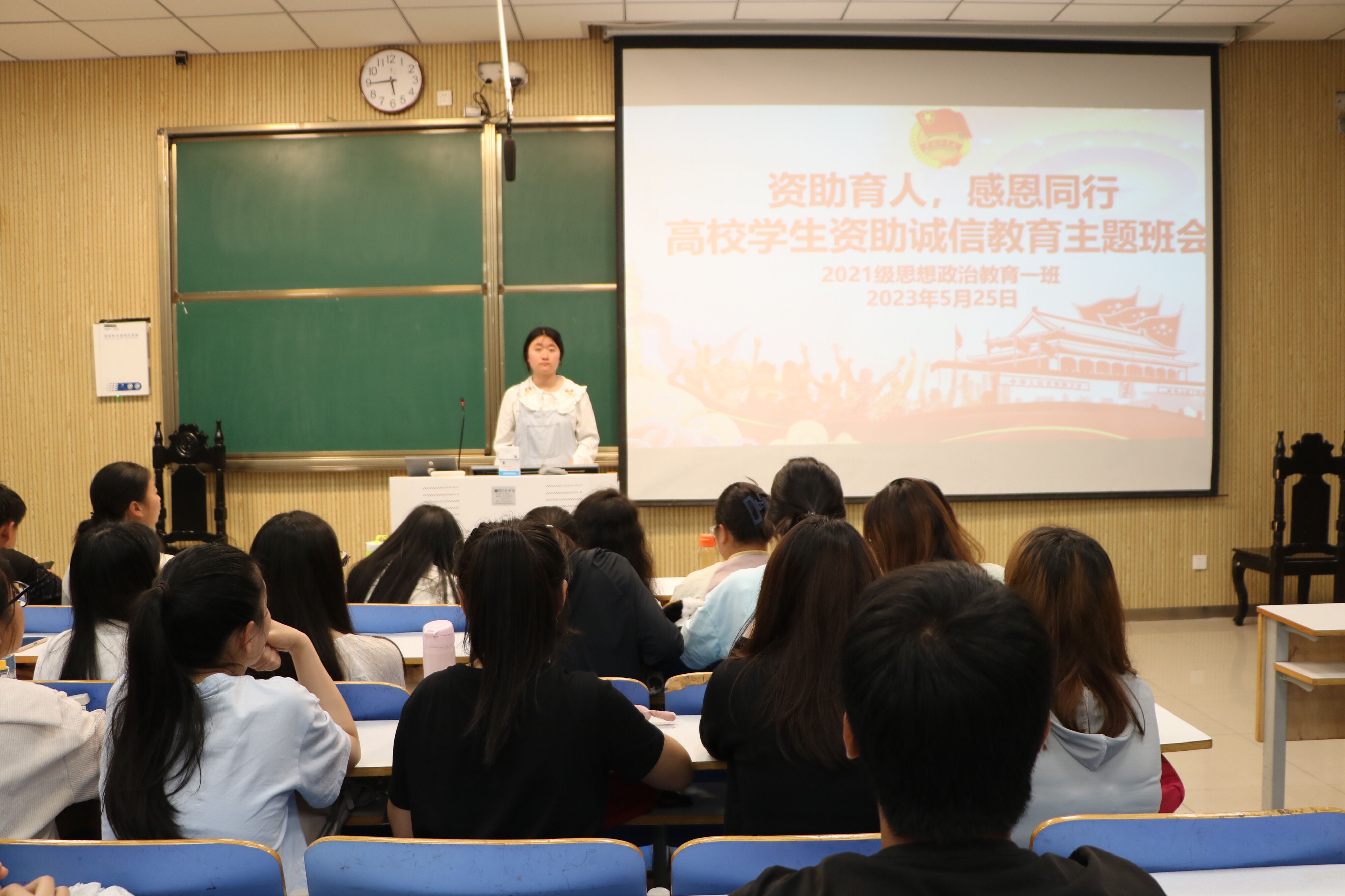 5月25日下午,beat365亚洲版官网2021级思想政治教育一班在社科楼514教室召开“资助育人,感恩同行”高校学生资助诚信教育主题班会。2021级思想政治教育一班全体成员共同参加了本次班会,班会由副班长雷敏主持。