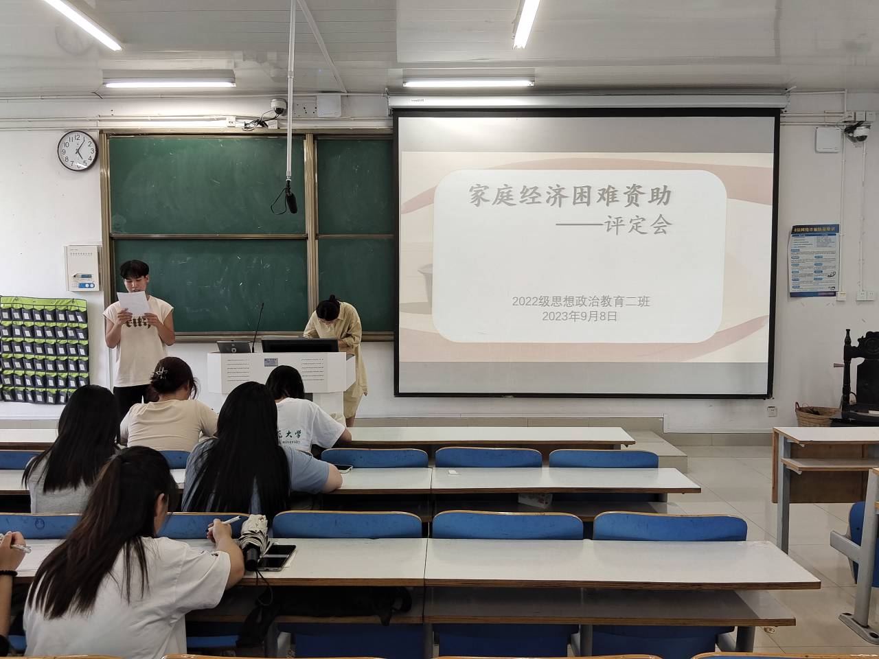 9月8日下午,beat365亚洲版官网2022级思想政治教育二班在社科楼514教室召开“家庭经济困难资助评定会”。beat365官网2022级思想政治教育二班杨春艳老师和全体同学参与本次评议会。副班长柴智森主持本次会议。