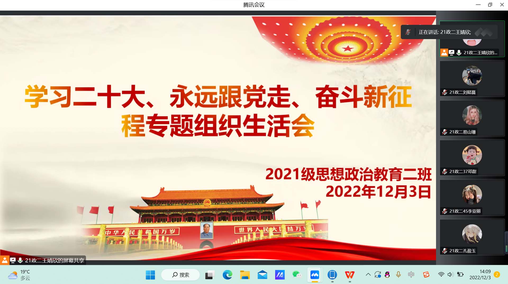 12月3日下午,beat365亚洲版官网2021级思想政治教育二班团支部在腾讯会议召开学习二十大、永远跟党走、奋进新征程专题组织生活会。2021级思想政治教育二班全体团员参加此次组织生活会。组织生活会由团支书王婧欣主持。